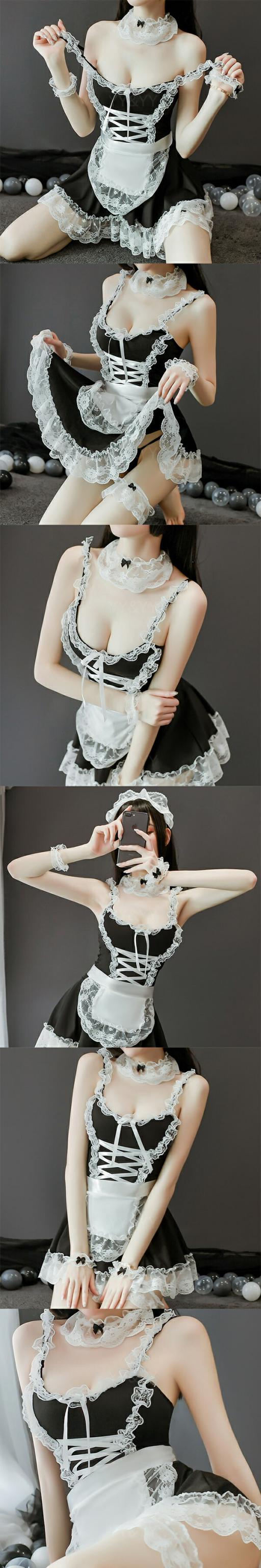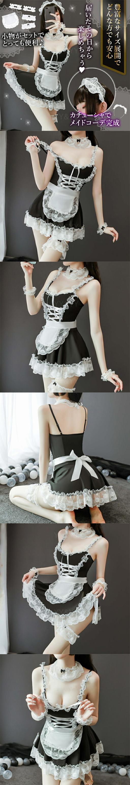 ★新デザインの豪華な7点セットのメイド服です。上質で可愛いコスチュームです。肩紐や裾の部分たっぷりレースをあしらい、女性らしさを引き出せるセクシーランジェリーです。レース付カチューシャや太ももリングなど、セットのものも多くて、色々とアレンジして着用できる部屋着です。肩紐はサイズ調節でき、大きいサイズも豊富でどんな体型の方でも安心して着用いただけます。
