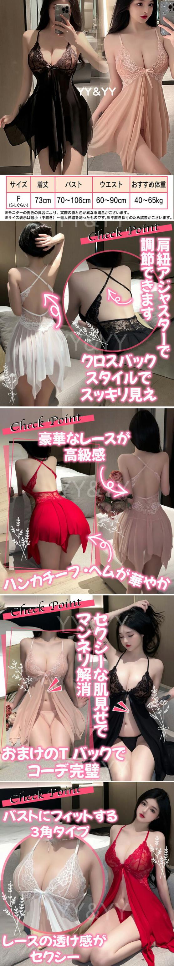 ★新デザインの下着です。とても上質なベビードールで、肌触りが良く、セクシーで上品に見えるランジェリーです。バックのフリフリデザインがポイントとなり、エレガントなベビードールです。肩紐はサイズ調節でき、バストの部分はワイヤーなし、パットなしでスケスケのシースルータイプです。柔らかいレースで肌触りが良くエロいたします。