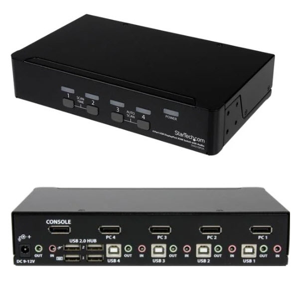 オーディオ、DisplayPort対応4ポートUSB KVMスイッチ。4台のPC/Macコンピュータで、次世代ディスプレイ技術規格に対応しながらシームレスなKVM制御を提供します。本製品は、2560x1600 @60HzのDisplayPort解像度と、3.5mm ステレオオーディオと7.1 HDデジタルオーディオの両方をサポートしています(ディスプレイとソースで対応している場合)。本体一体型のUSBハブが付いており、接続されたコンピュータ間で、2台のUSB周辺機器を共有することができます。それぞれのマシンに直接USB機器を接続した場合と変わりなくシームレスに動作します。最大3840x2400の解像度も低リフレッシュレートで対応しており、MRIやX線など、高画質静止画を扱う医療機器などの用途に適しています。フロントパネルの押しボタンとホットキー操作による切り替えをサポートしており、シンプルながら複数の切り替え操作オプションにも対応する便利なソリューションです。また、接続ポートが背面についた小型の筐体は、ワークスペースで邪魔にならない設計になっています。StarTech.comでは、本製品に3年間保証と無期限無料技術サポートを提供しています。