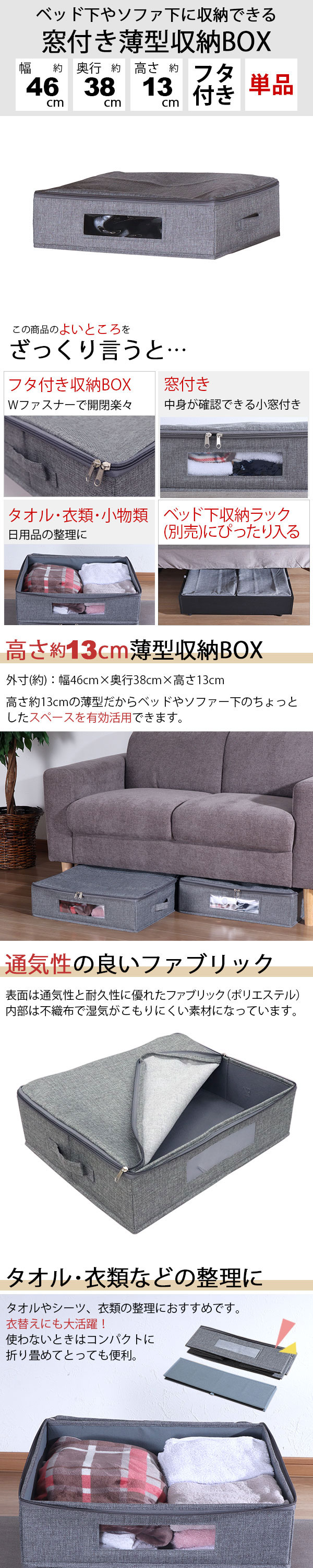 商品名:ベッド下収納 ふた付き 取っ手付き 幅46cm 奥行38cm 高さ13cm 衣類 収納ケース 中身が見える 収納ボックス 薄型 46×38 ベッド下 収納 おしゃれ 窓付き 収納ボックス 隙間収納 衣装ケース 布製 スリム ファスナー付き ホコリ対策 軽量 インナーボックス グレー 1個単品 衣服収納 衣替え 家具 インテリア 収納家具 収納BOX 収納袋 浅型 衣類収納ケース 不織布 衣類収納袋 すきま収納 すき間収納 タオル収納 シーツ オフシーズン 収納 コンパクト 省スペース 新生活 一人暮らし ワンルーム クローゼット 押し入れ ソファ下 ベッド下 シンプル ナチュラル 湿気に強い 通気性 すっきり 整理整頓