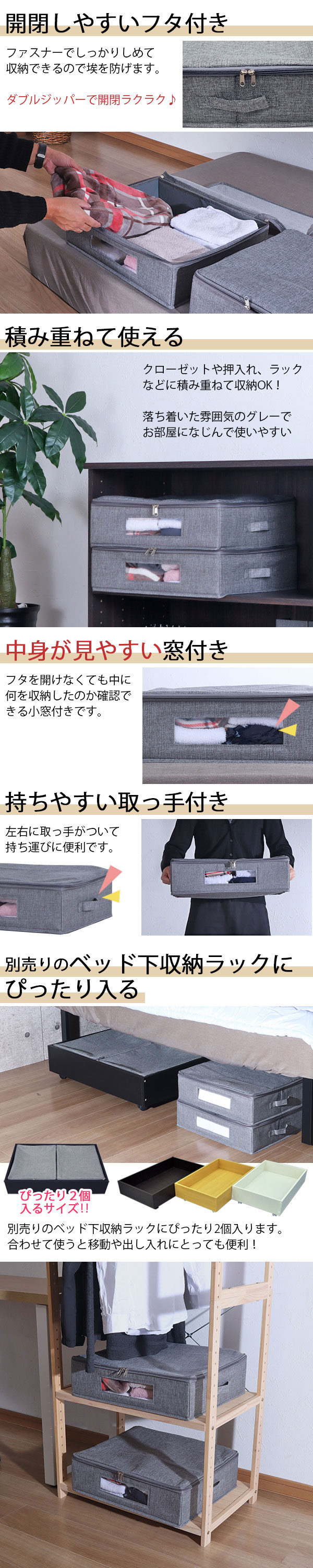 浅型窓付き収納ケース 収納した中身が一目で分かる 使いたいときにスムーズに取り出せる ほこりをしっかりガード 簡単に開閉できる 持ち運びしやすい 取り出しやすい 使わない時は折りたたんでコンパクトに収納 必要な時だけサッと広げて使用可能 サラッとした肌触り ツイードのような表情のある質感の生地 寝具収納 クローゼット上 別売のベッド下収納ラックと一緒にお使いいただくと、更に収納力や取り出しやすさがUP