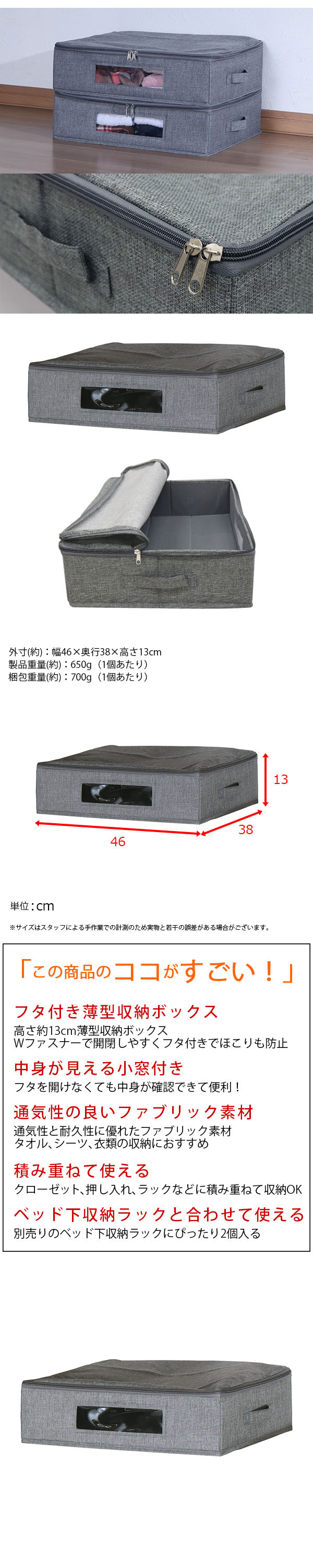 商品名:ベッド下収納 ふた付き 取っ手付き 幅46cm 奥行38cm 高さ13cm 衣類 収納ケース 中身が見える 収納ボックス 薄型 46×38 ベッド下 収納 おしゃれ 窓付き 収納ボックス 隙間収納 衣装ケース 布製 スリム ファスナー付き ホコリ対策 軽量 インナーボックス グレー 1個単品