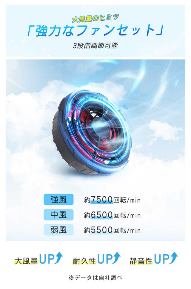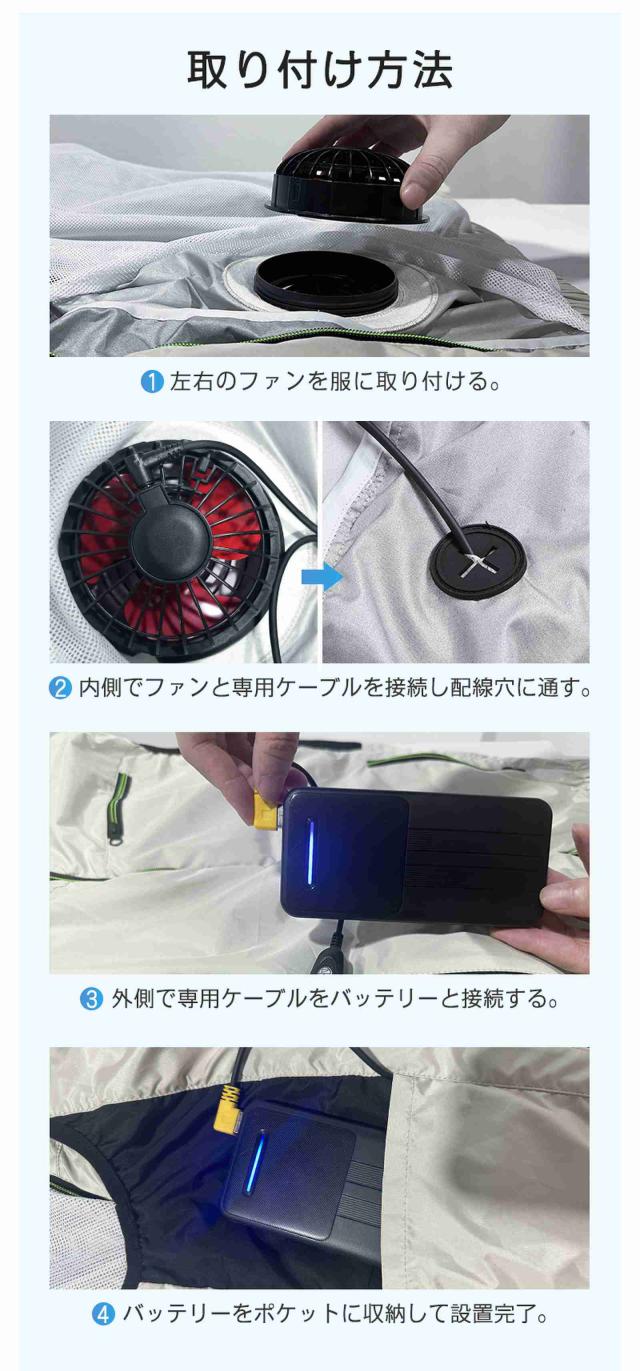 作業服のファンは大面積羽根を採用して、風がより強くなるので快適に過ごせます。接続ケーブルで4段階風量を調整できます。