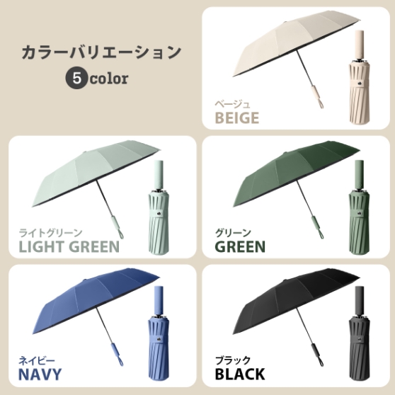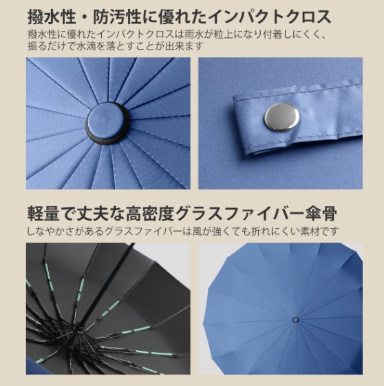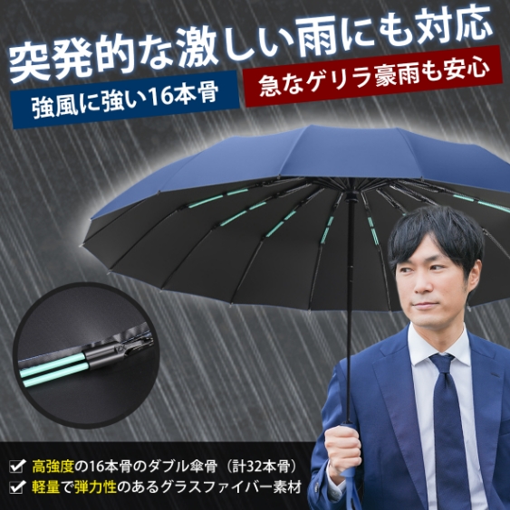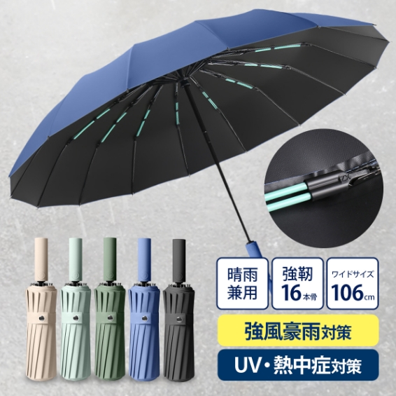 【16本骨耐強風】柔軟性と強度を兼ね備えた16本骨を採用し、風に対する耐性と耐久性が向上しています。さらに、錆びにくい防食加工が施された傘のフレームは非常に頑丈で、強風や激しい雨にも耐えられ、折れたり曲がったりしにくい設計です。