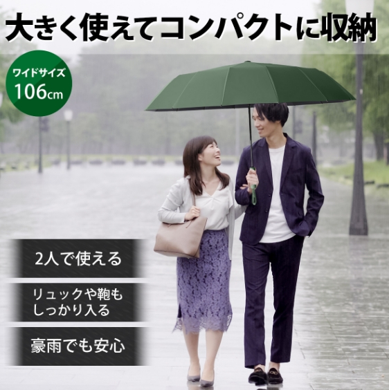 【濡れにくい】開いた状態で直径約106cm、通常の紳士傘に比べて、傘を差しながら荷物を持っていてもリュックを背負っていてもしっかりカバーしてくれて、ほとんど濡れません。折りたたむと長さ約34cmとなり、急な雨に備えてカバンなどに簡単に収納できます。
