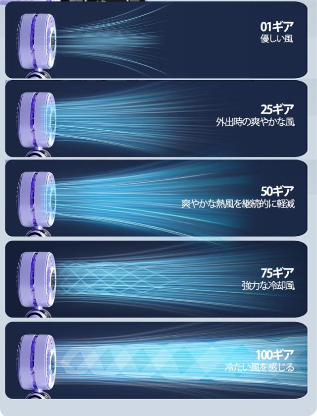 この高速ハンディファンはハンドルの側面に速度調整デザインが追加されており、電源ボタンを押すだけで風速を1から100までカスタマイズで、ニーズに応じて自由に調節することができます。また、お使いやすいように、01?25?50?100この5つ快速段階が設置されており、スイッチを1回押すだけで簡単に風を大きくすることができます。