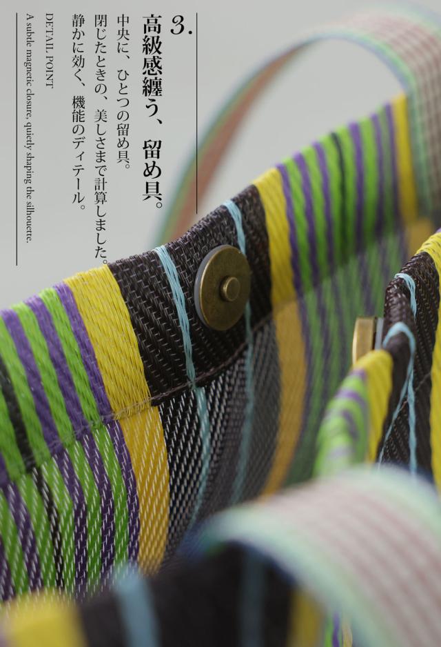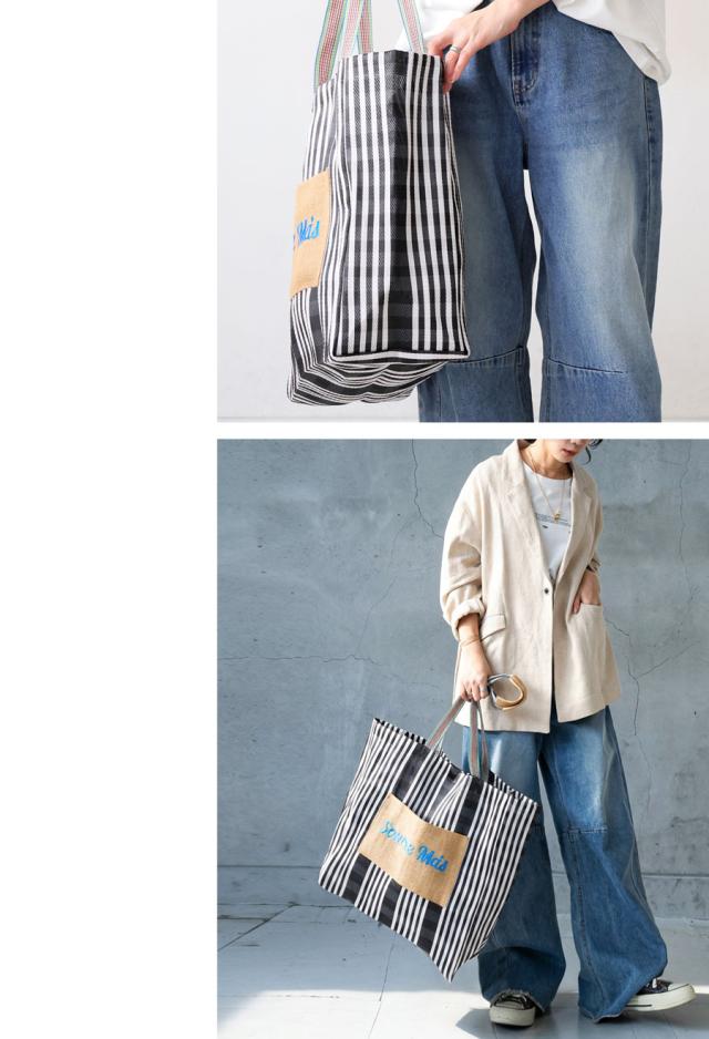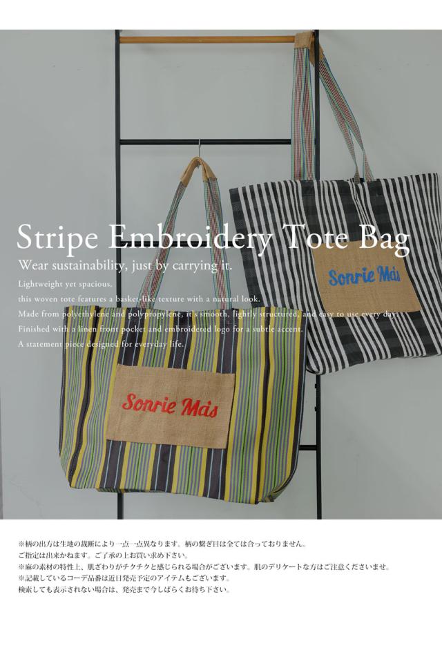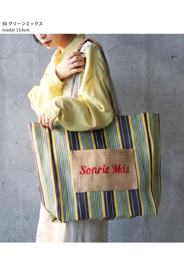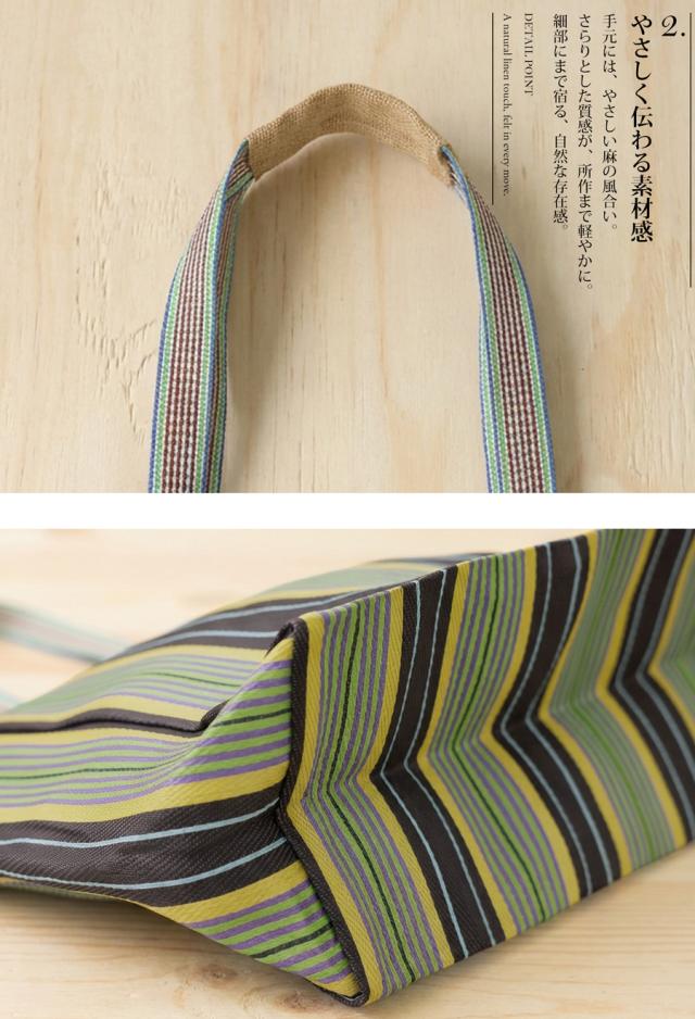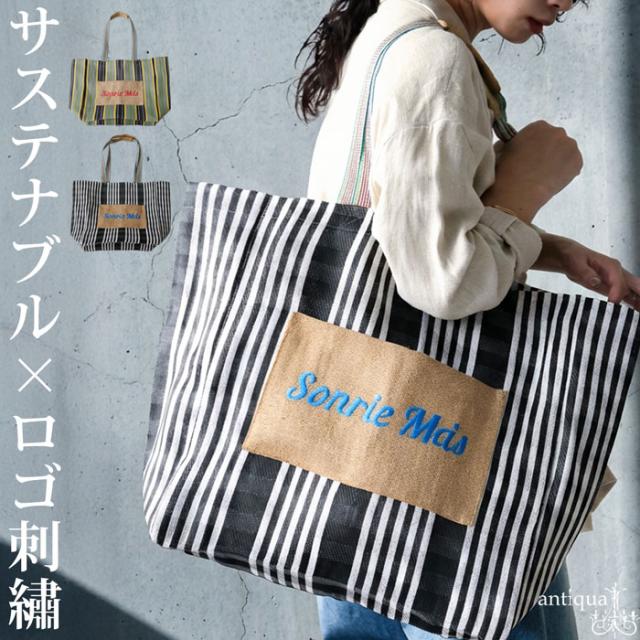 iya-00129 バッグ 鞄 サステナブル素材 手織り リサイクル 軽量 ナチュラル 刺繍 ロゴ ストライプ 柄 肩掛け 差し色 手作り風 トレンド感 旅行 通勤 買い物 マチ付き ポケット付き