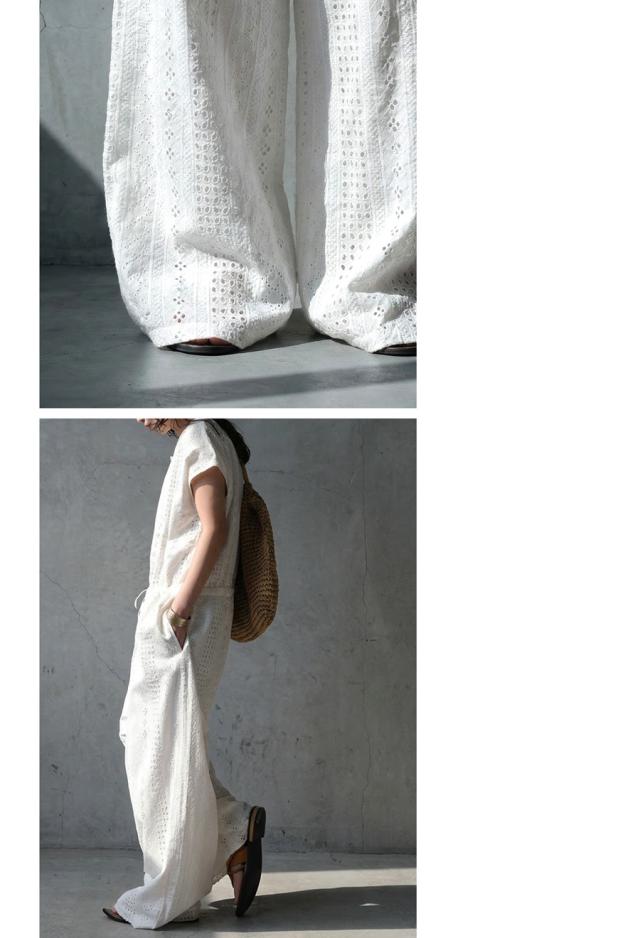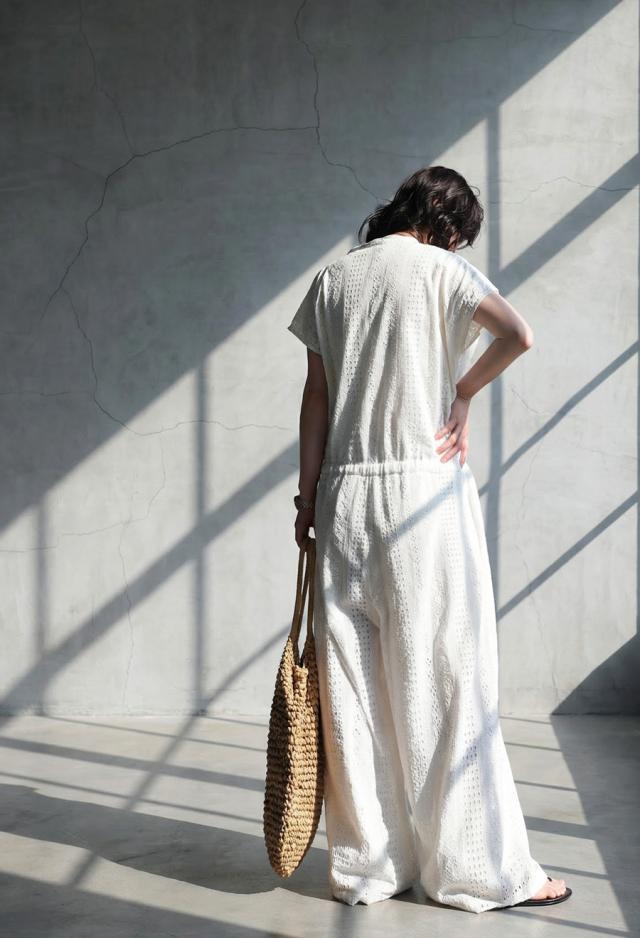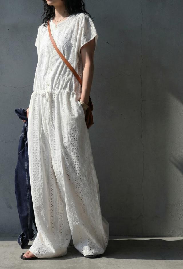 iya-00131 サロペット 総柄 シフリー刺繍 インド綿 コットン ラウンドネック クルーネック フレンチスリーブ ドロスト ゆったり 体型カバー 高級感 上品 ナチュラル カジュアル つなぎ