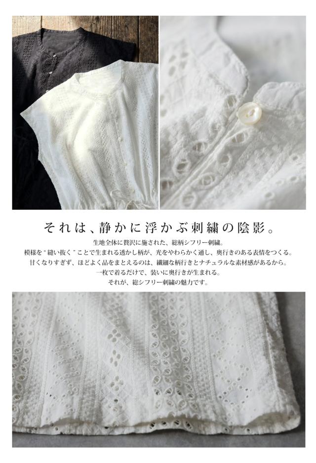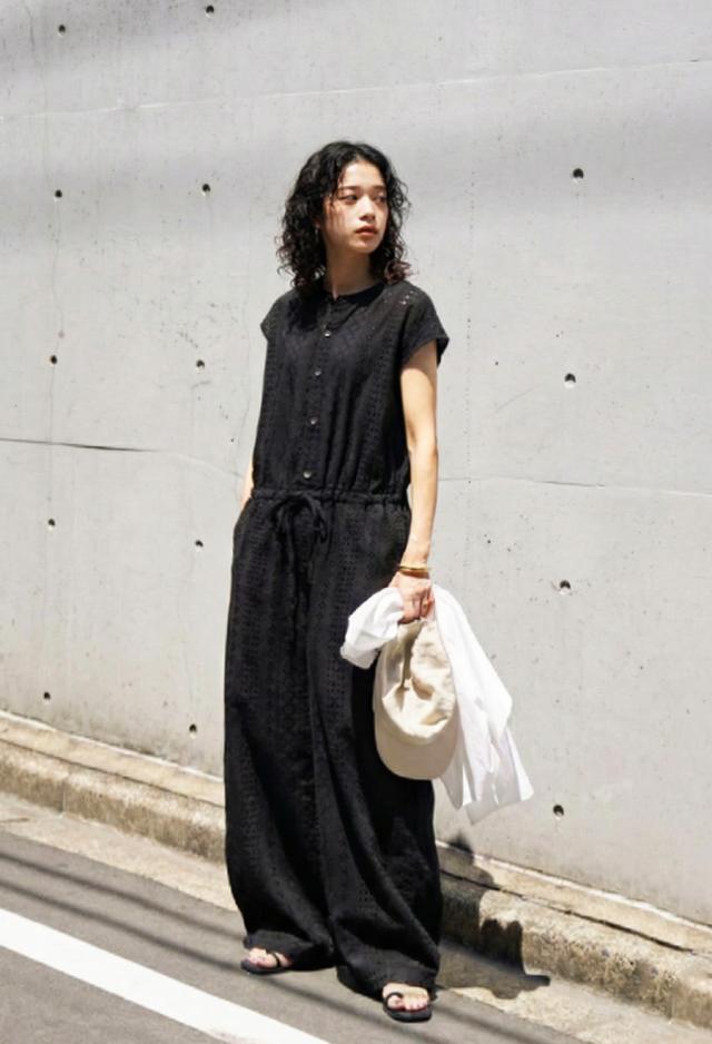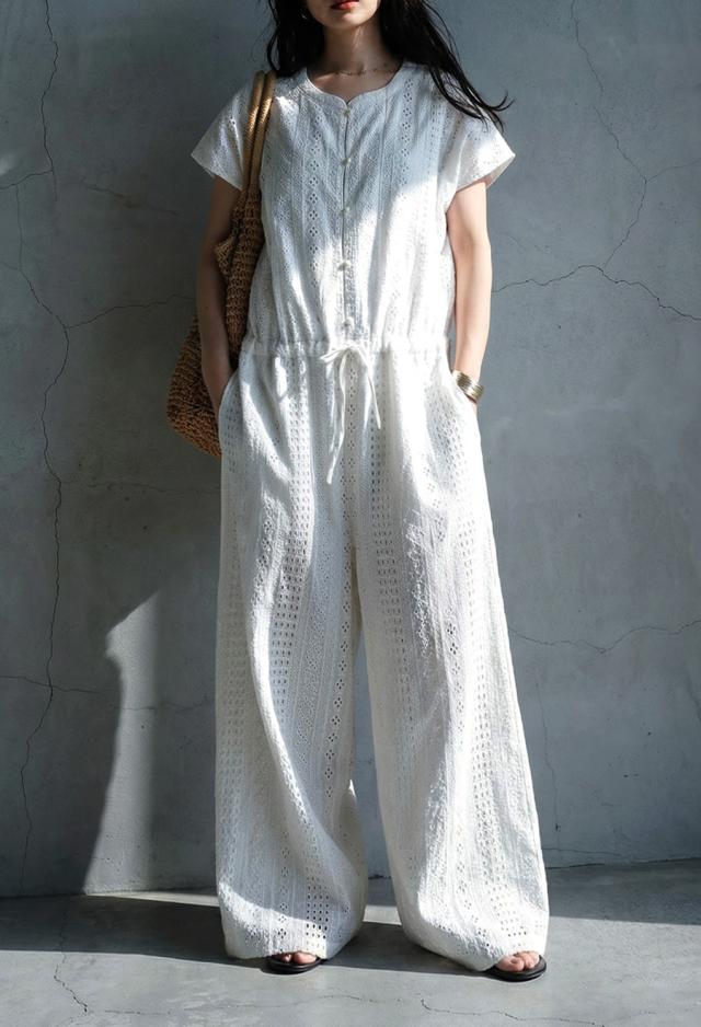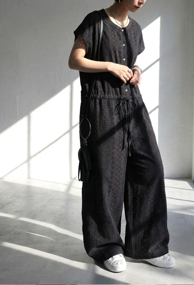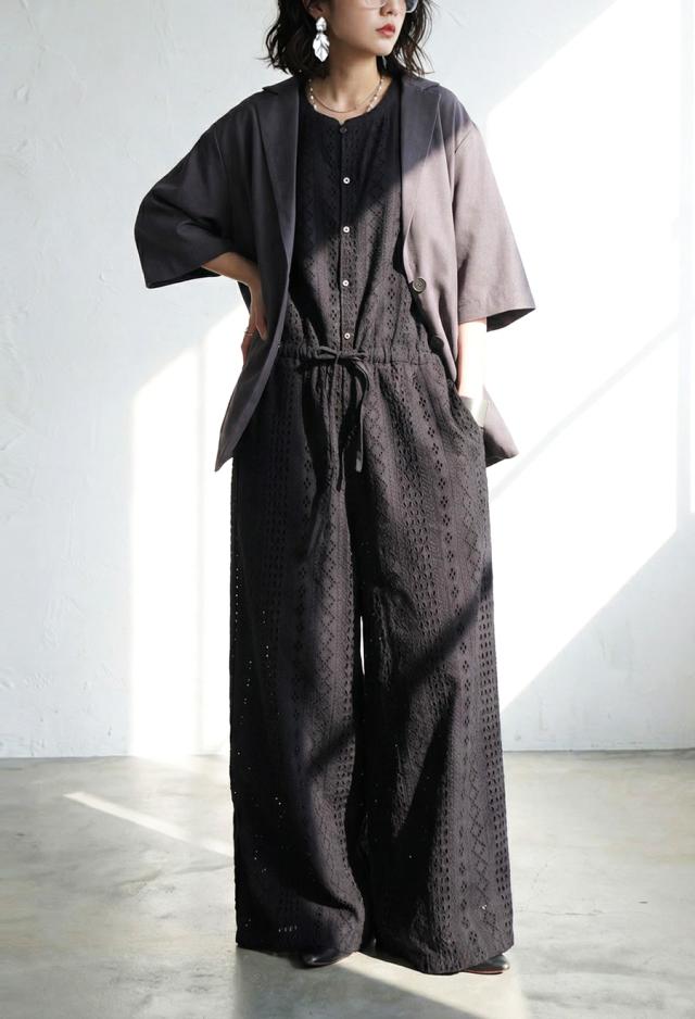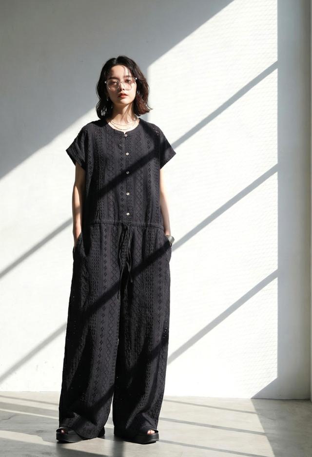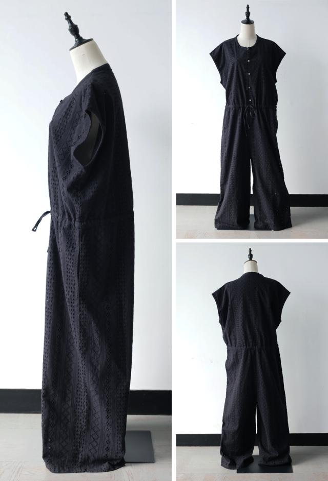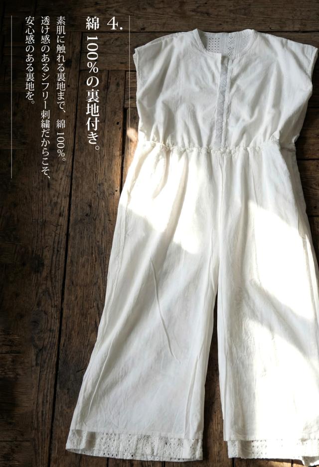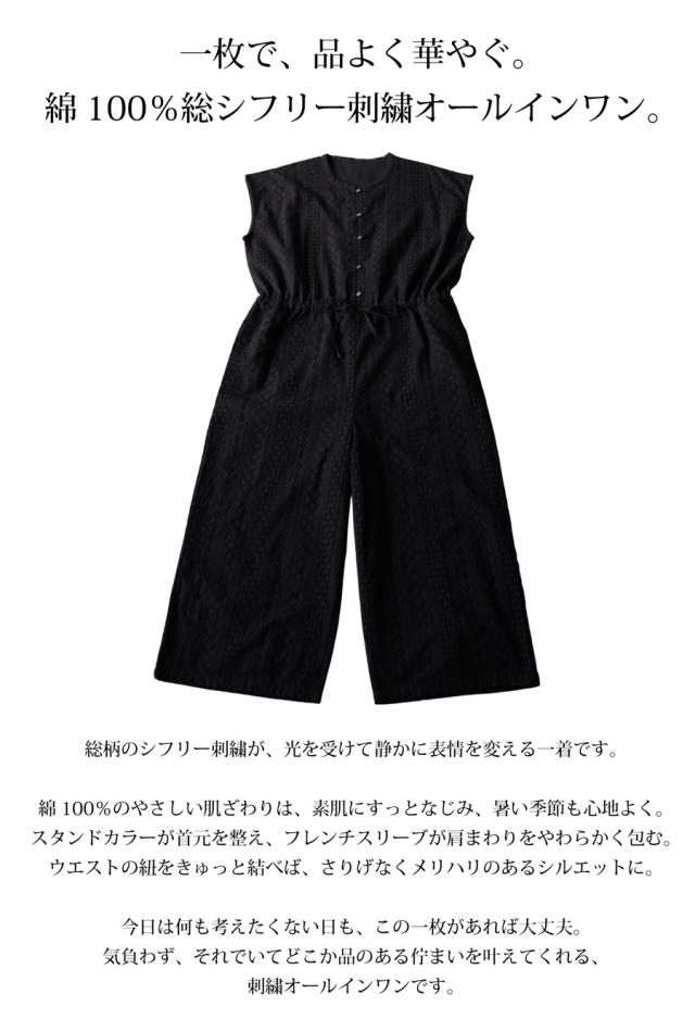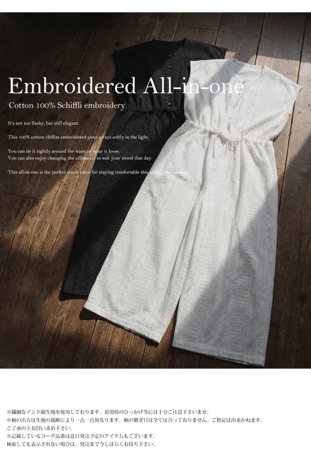 綿(コットン)100%の総柄シフリー刺繍生地で仕立てた、高級感あふれるオールインワン(サロペット)です。