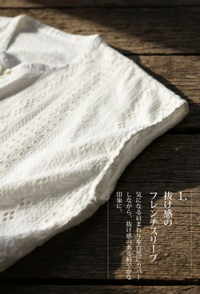 肩をやさしく覆うフレンチスリーブの袖丈(半袖)が二の腕をさりげなくカバーします。