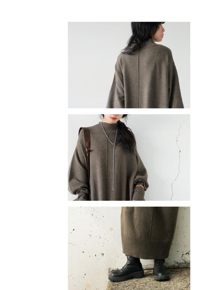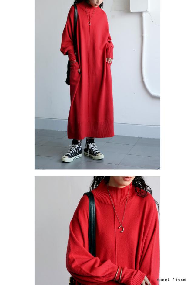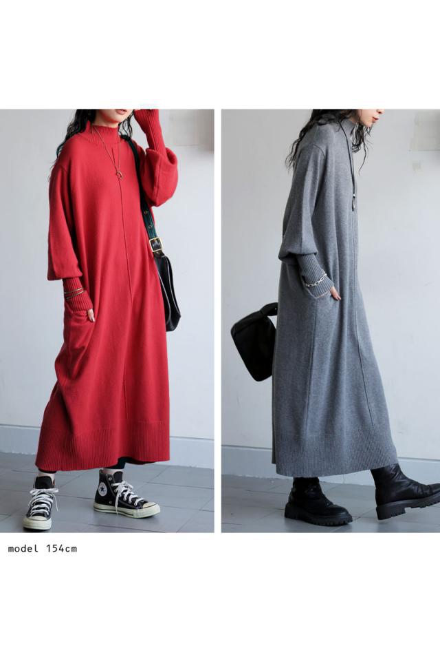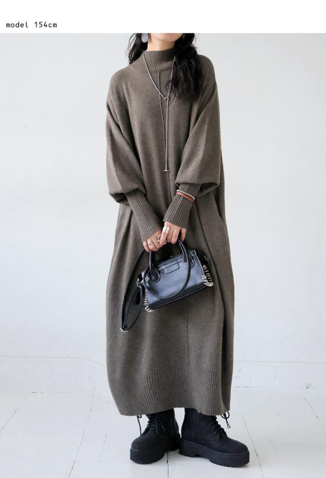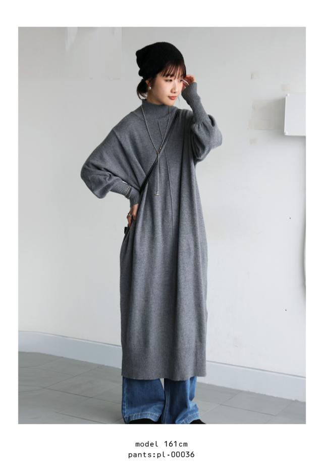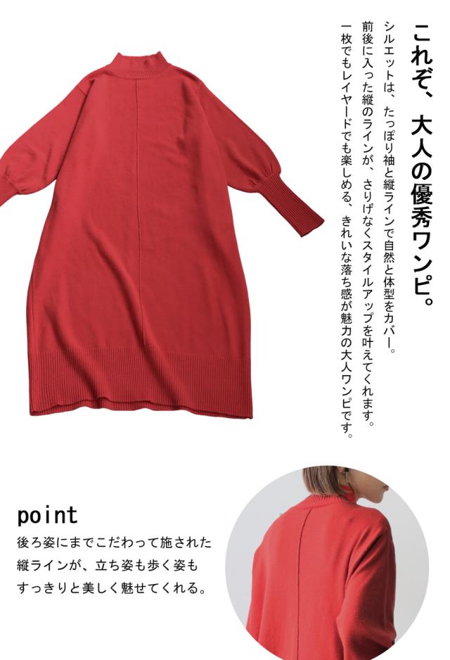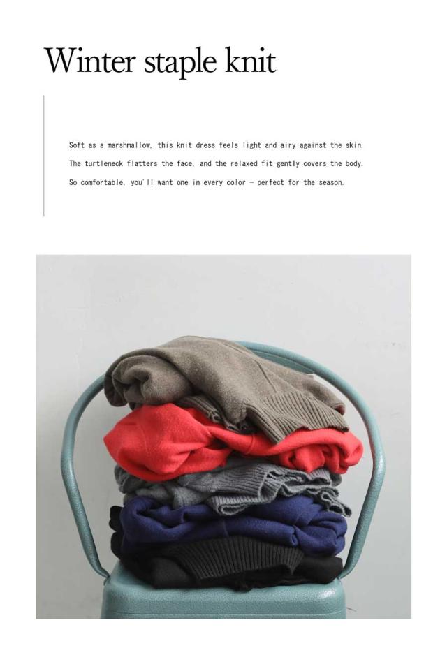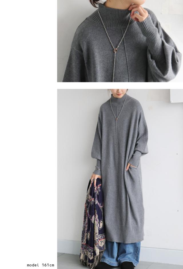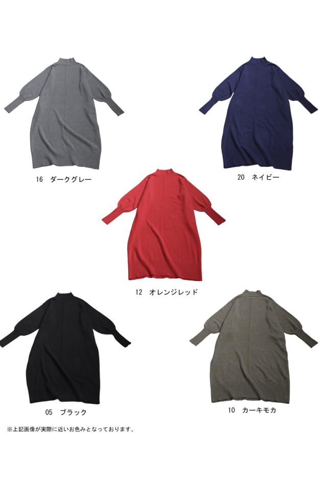 pn-00585 ワンピース ニット ワンピ 無地 長袖 タートルネック 縦ライン 体型カバー 小顔効果 マシンウォッシャブル カジュアル シンプル きれいめ ナチュラル ポケット付き リブ