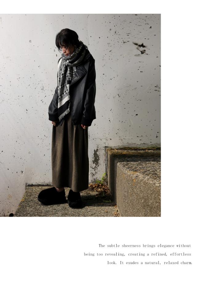 柄は無地、形状は前後に縦ラインの編地を施したストレートシルエットで、縦長効果をプラスします。