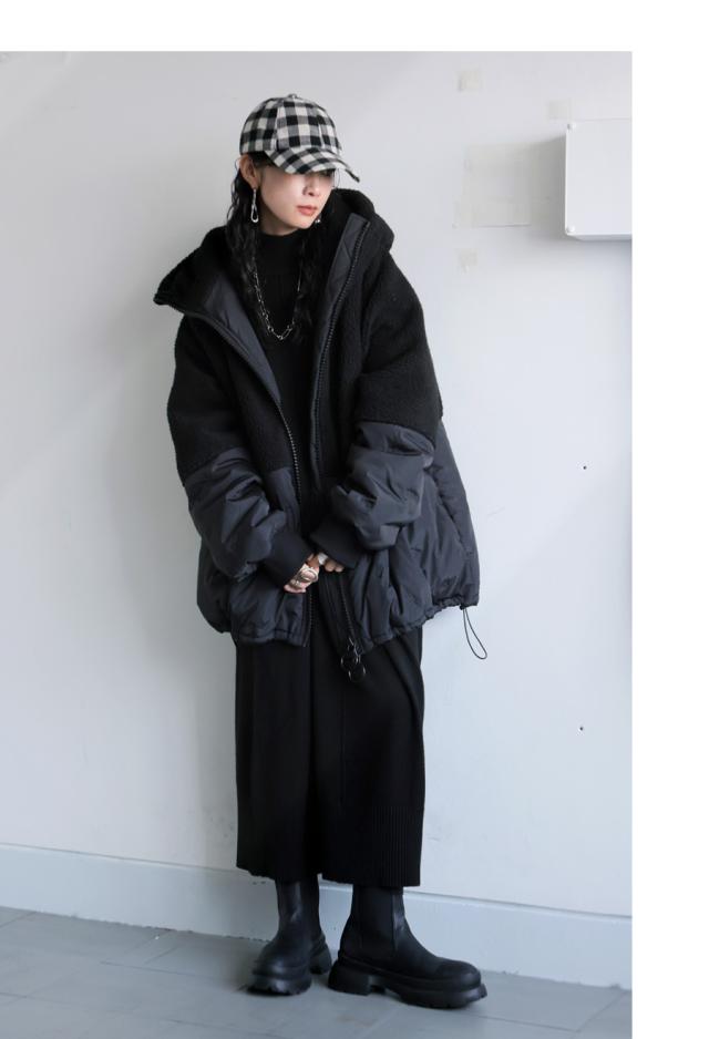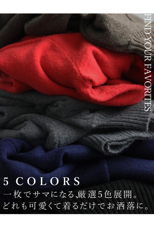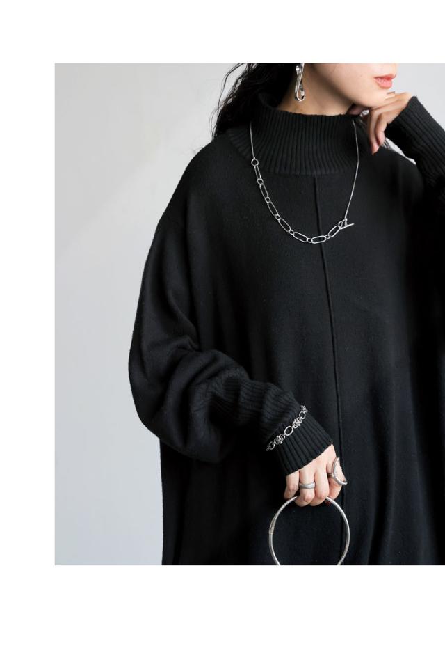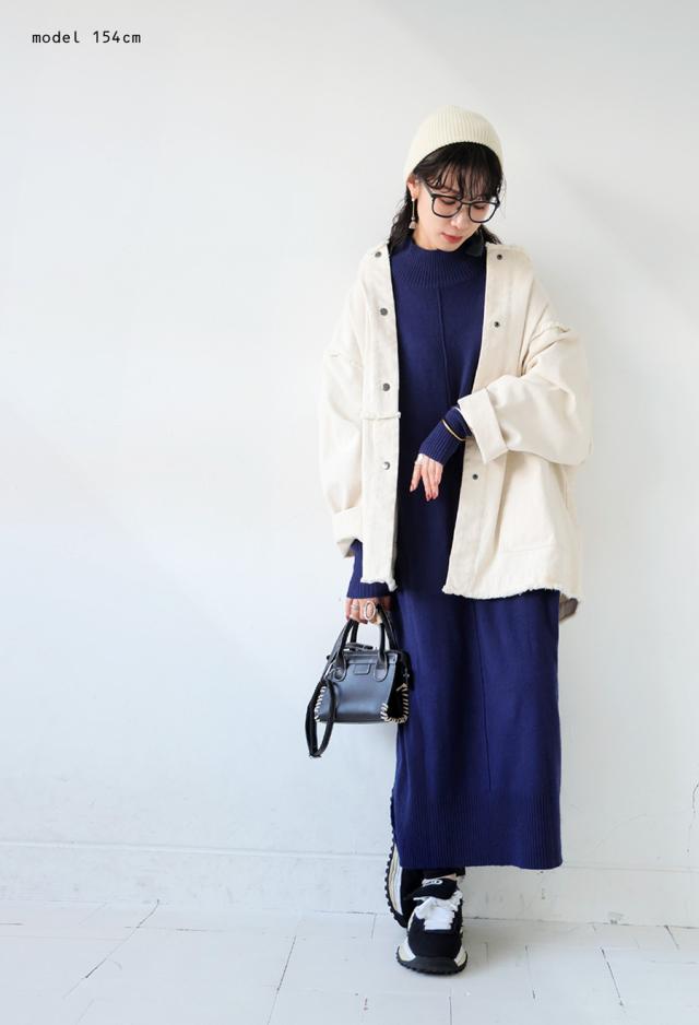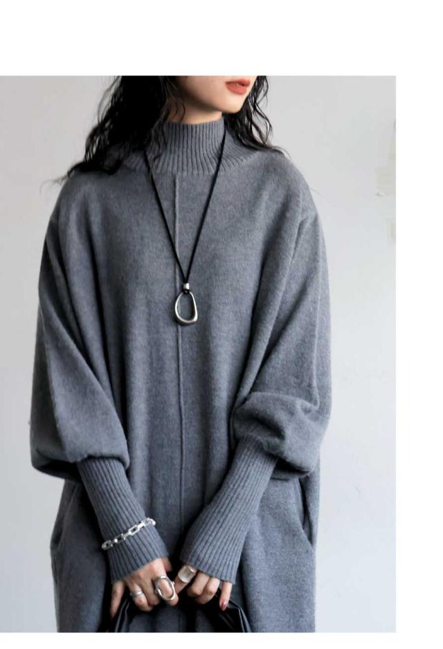 ネックラインは首元を優しく包むタートルネック(ハイネック)仕様で、小顔効果と防寒性を両立。