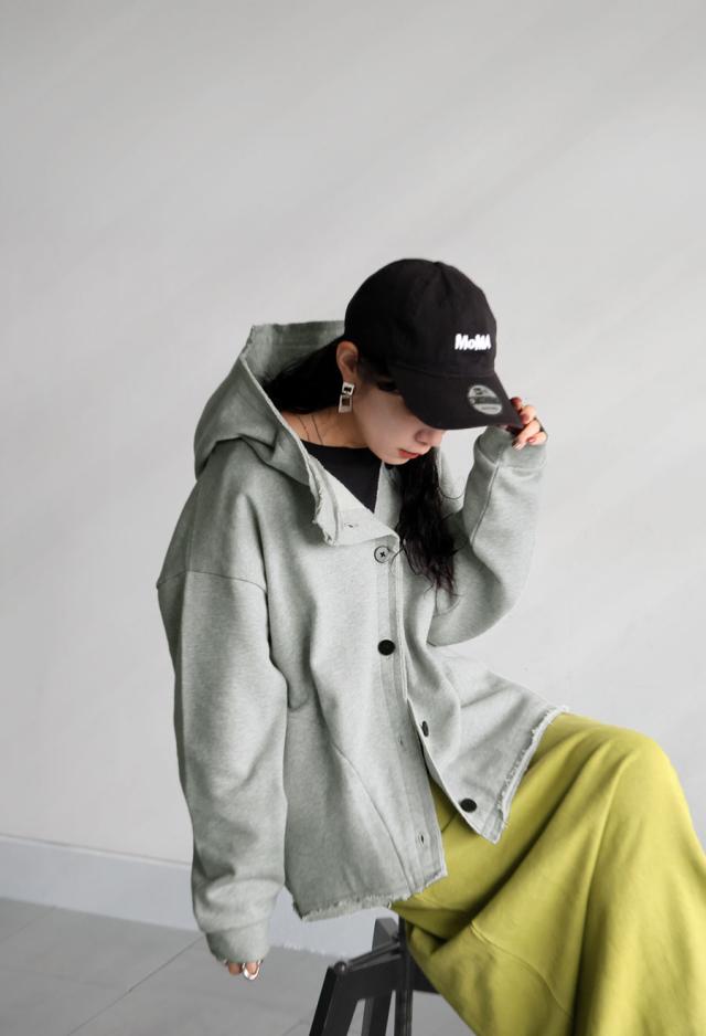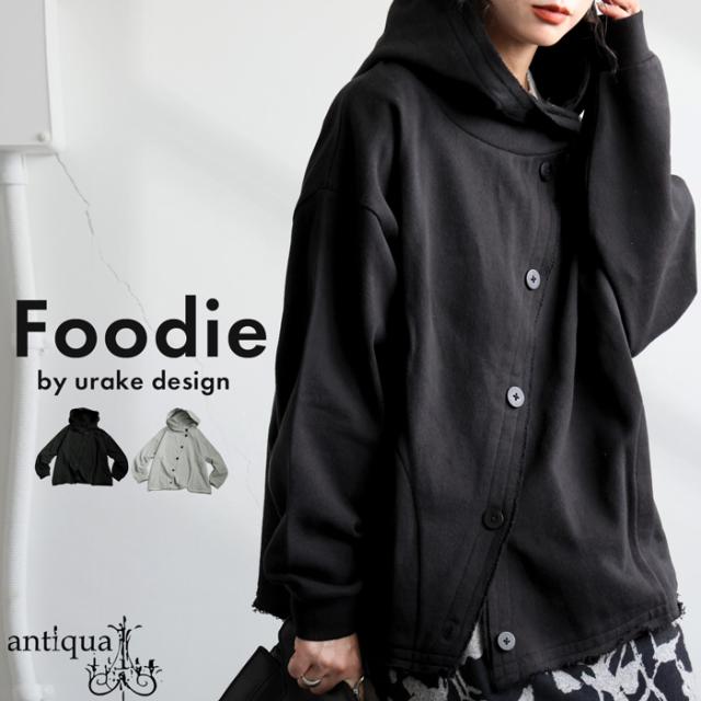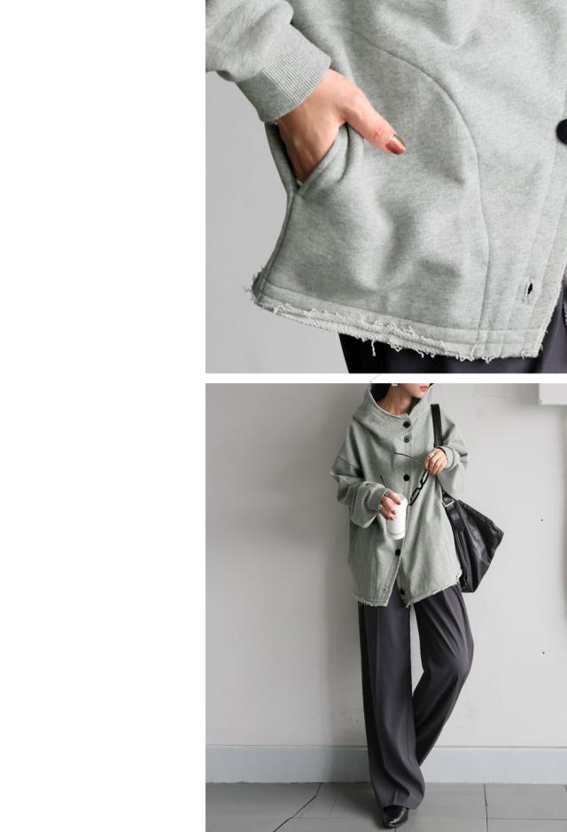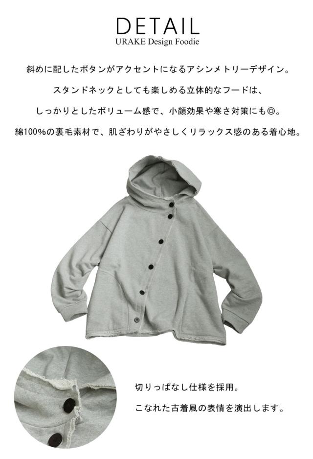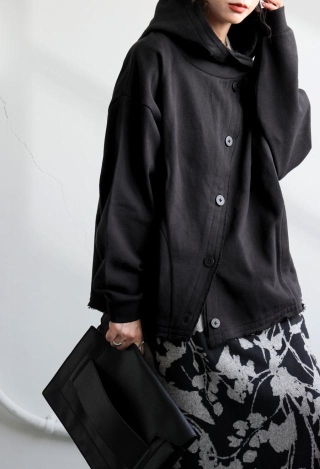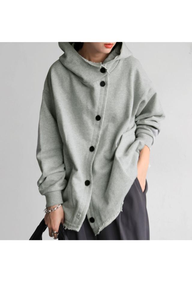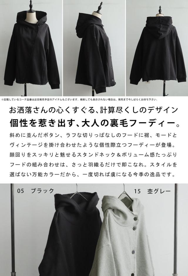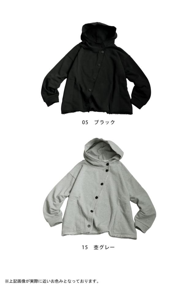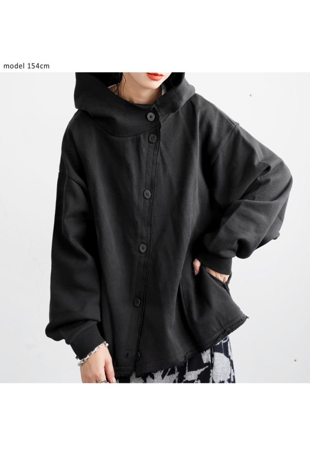 pn-00586 パーカー スウェット 綿100 コットン フード付き ボタンデザイン アシンメトリー ゆったり ミディアム丈 体型カバー 無地 羽織り 長袖 ポケット付き 切りっぱなし