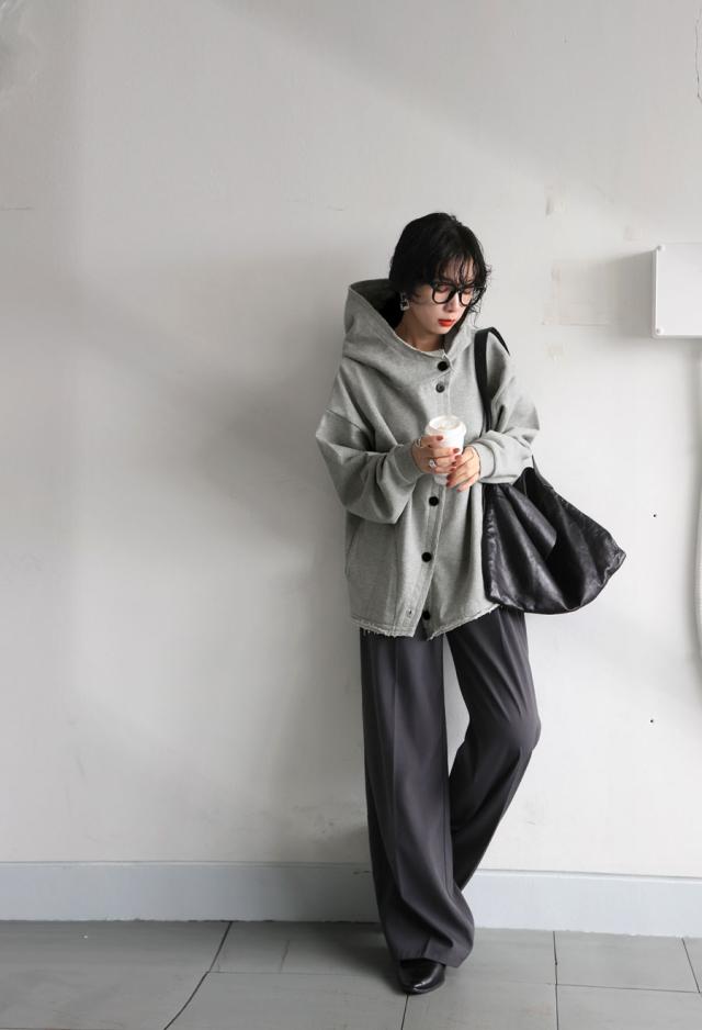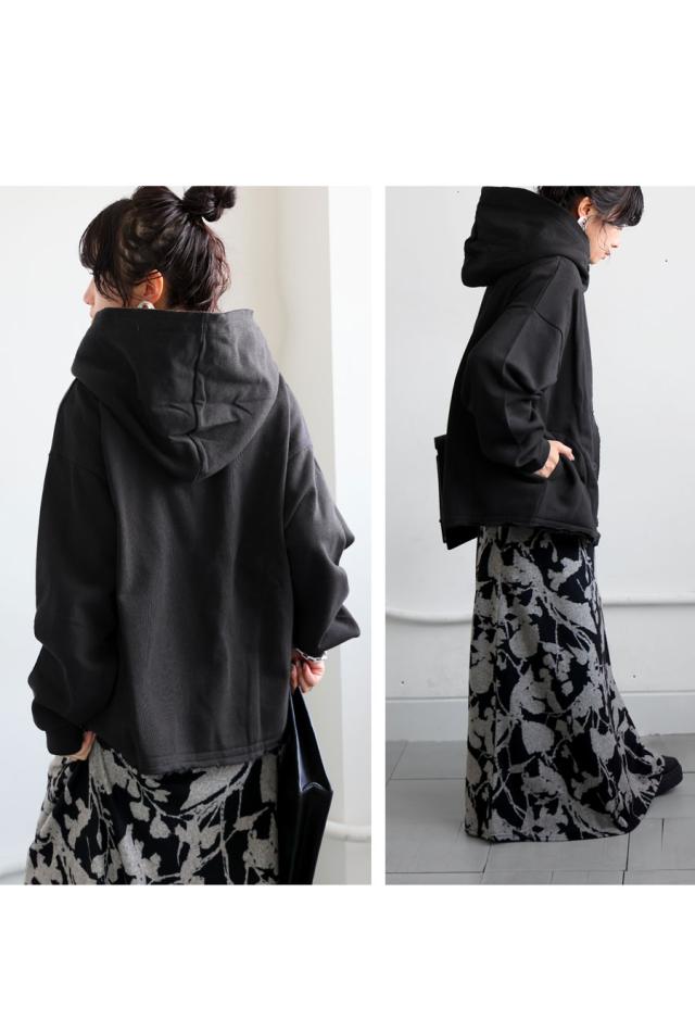 ネックラインは立体感あるフード付きのスウェットデザインで、顔まわりをすっきりと見せる形状。