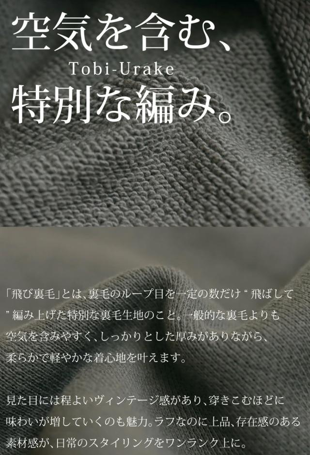 飛び裏毛ならではの柔らかくしっかりとした生地感で、肌あたりも快適。