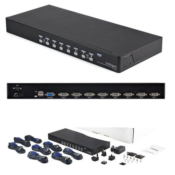 ラックマウント対応8ポートUSB KVMスイッチキット。8台のサーバ/PCに接続するためのケーブルとアクセサリをすべて同梱しており、セットアップが簡単ですぐに導入できる便利なKVMスイッチキットです。 このUSB KVMは、ワンセットのキーボード、マウス、ディスプレイで、最大8台までのUSB接続コンピュータを制御する信頼性の高いコンピュータ管理ツールを提供します。切り替え制御は、ホットキーコマンドまたはフロントパネルのプッシュボタンのどちらでも行うことができ、便利なオンスクリーン ディスプレイ設定機能も備えています。 1Uラックのキャビネットスペースに取り付けることも可能なため、サーバールームでの使用に適しています。複数のKVMスイッチをカスケード接続し、スイッチ1つで最大64台のコンピュータの制御が可能です。 StarTech.comでは3年間保証と無期限無料技術サポートを提供しています。