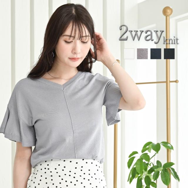 ・ラウンドネックとvネック前後両面着用できる2way仕様の半袖フリルニット。