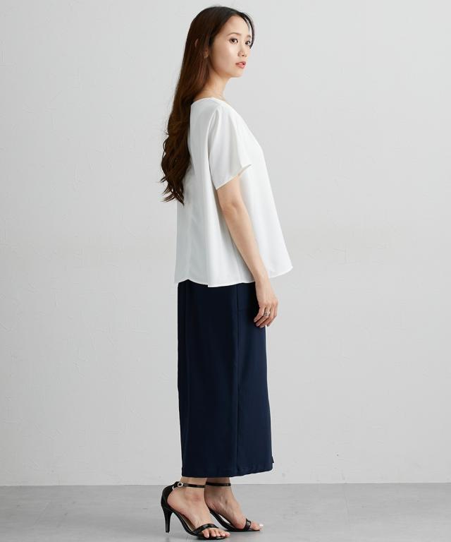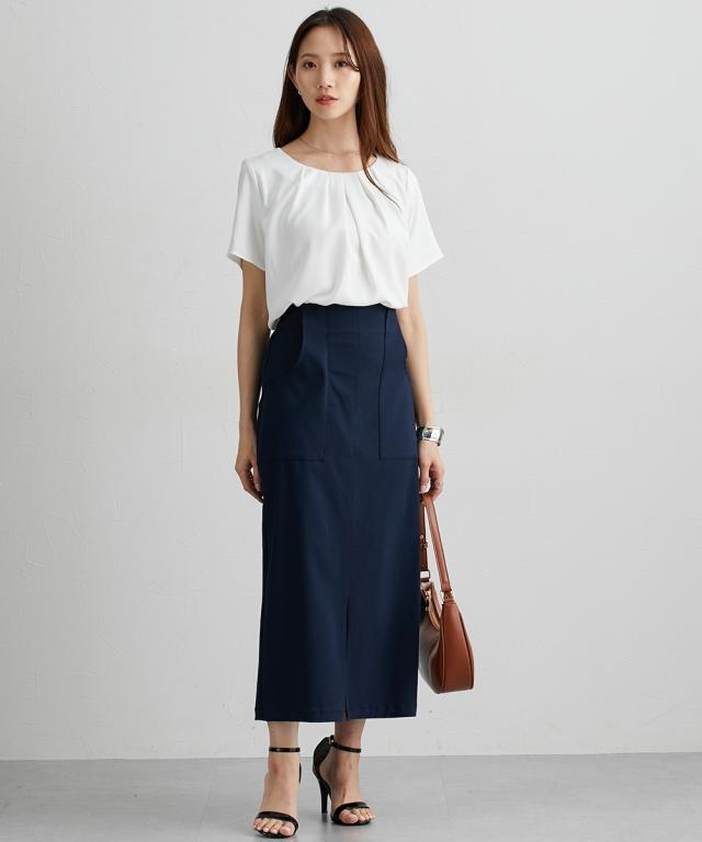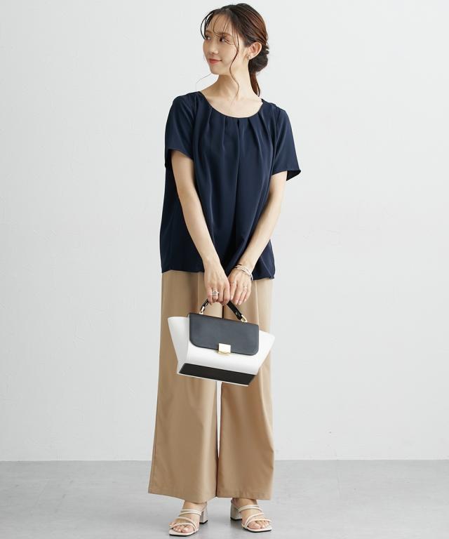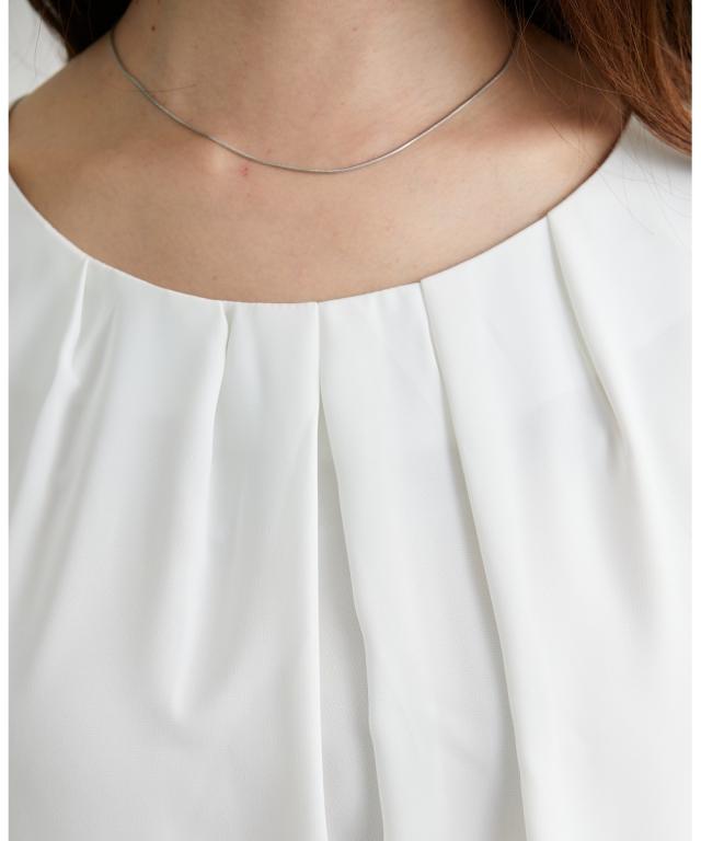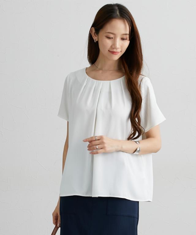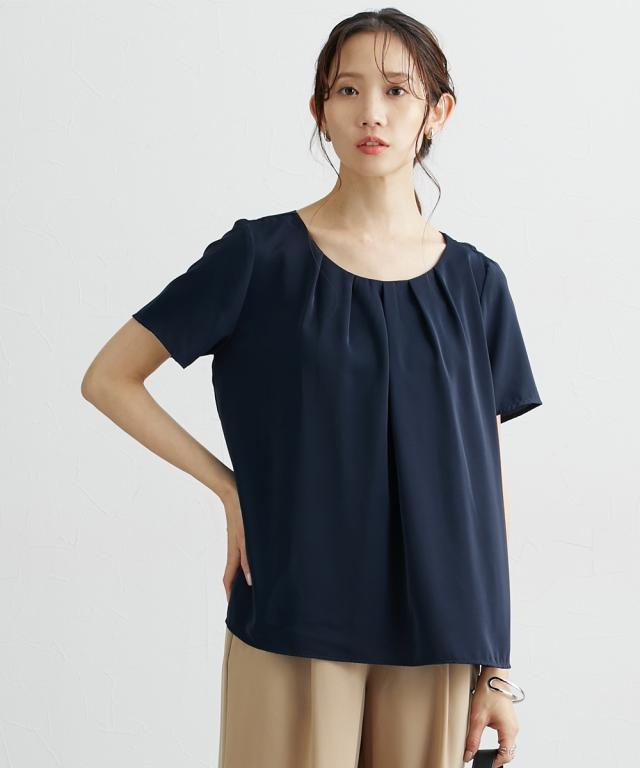 ■デザイン シンプルなブラウスに衿元ギャザーデザインで一枚でもジャケットインにも着映えるブラウス ■素材 ポリエステル素材でやや光沢感がありしわになりにくいのもおすすめポイント。接触冷感機能で肌に触れるとひんやり!UVカット機能付きで夏に便利なアイテムです。裏地が無いので真夏にも使いやすいアイテム。 ■おすすめのスタイリング Tシャツよりもきちんと感が出せるのでお仕事にはきれいめスカート、オフホワイトの日にはデニムに合わせてカジュアルダウンも得意なアイテム