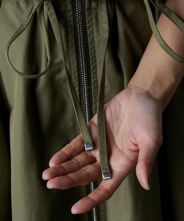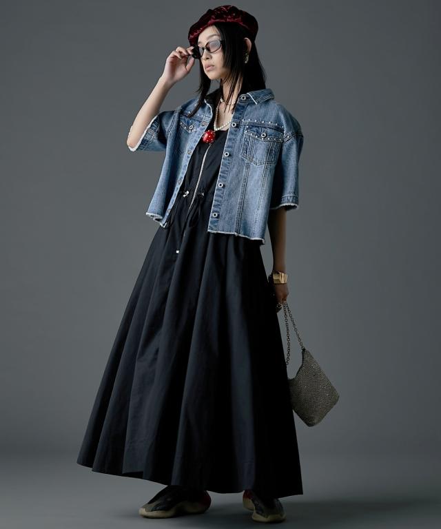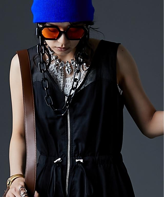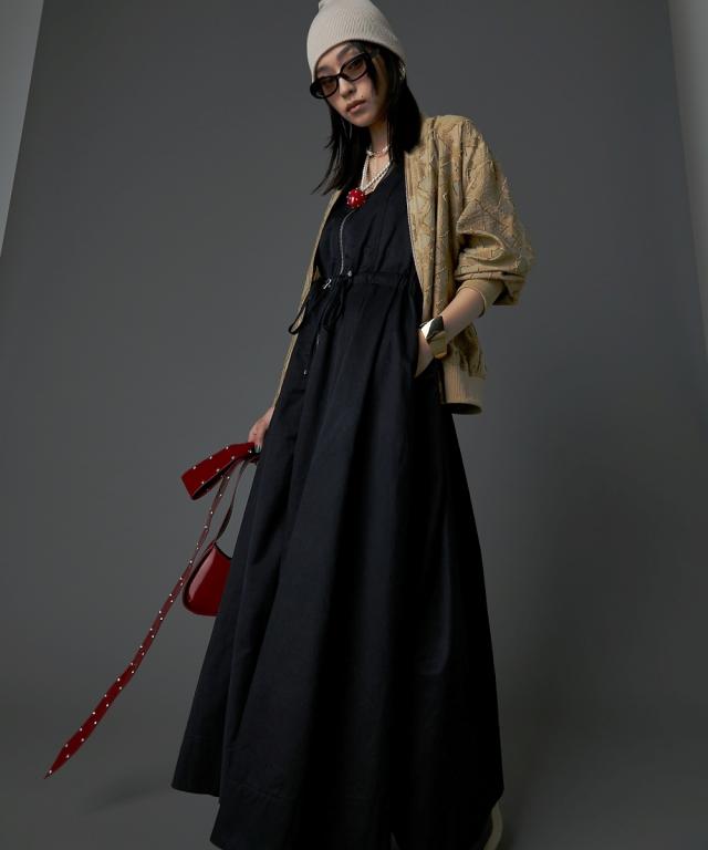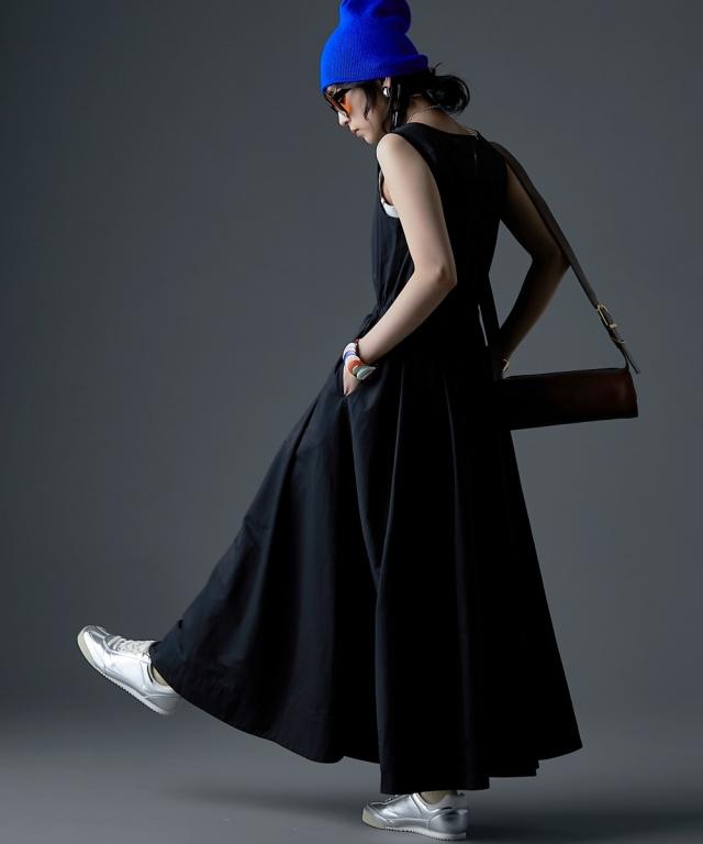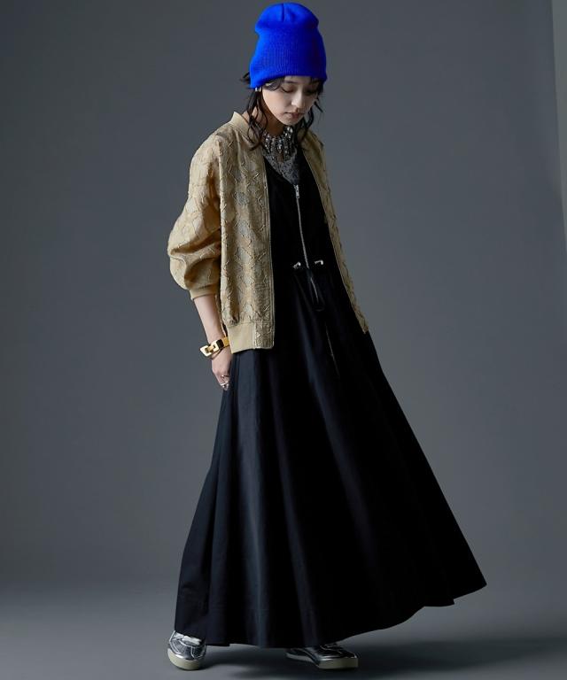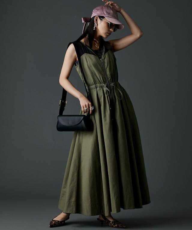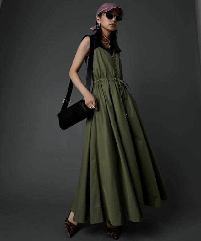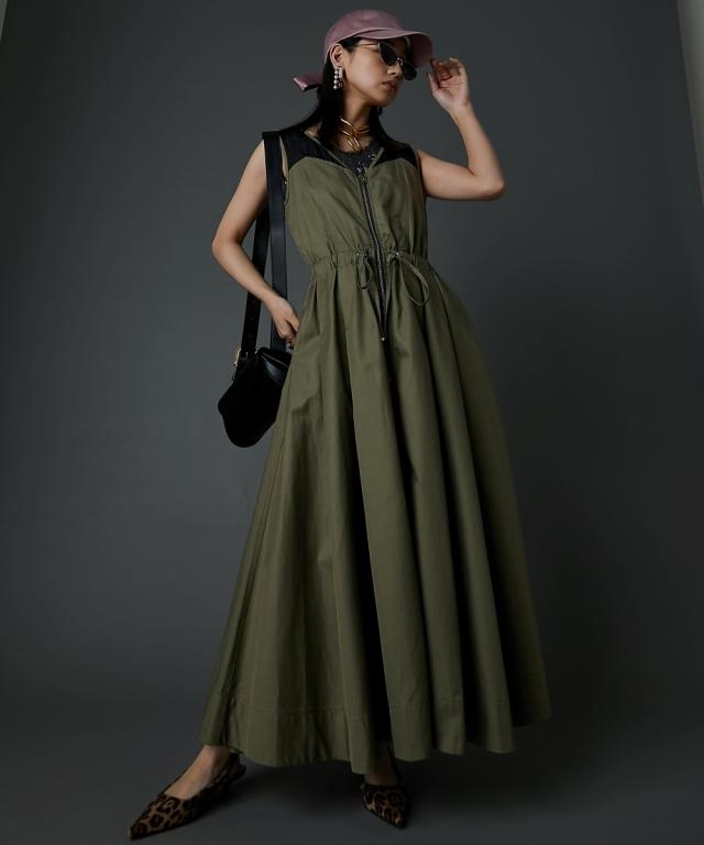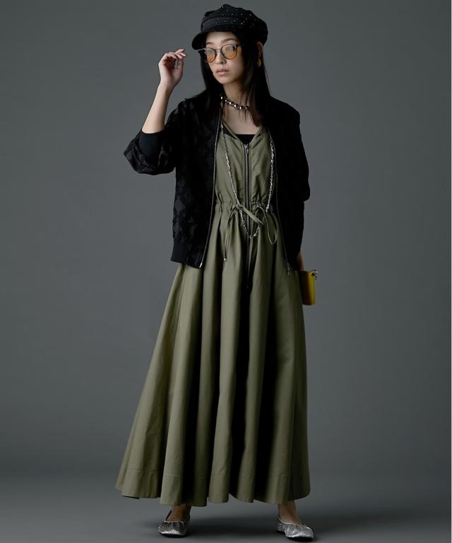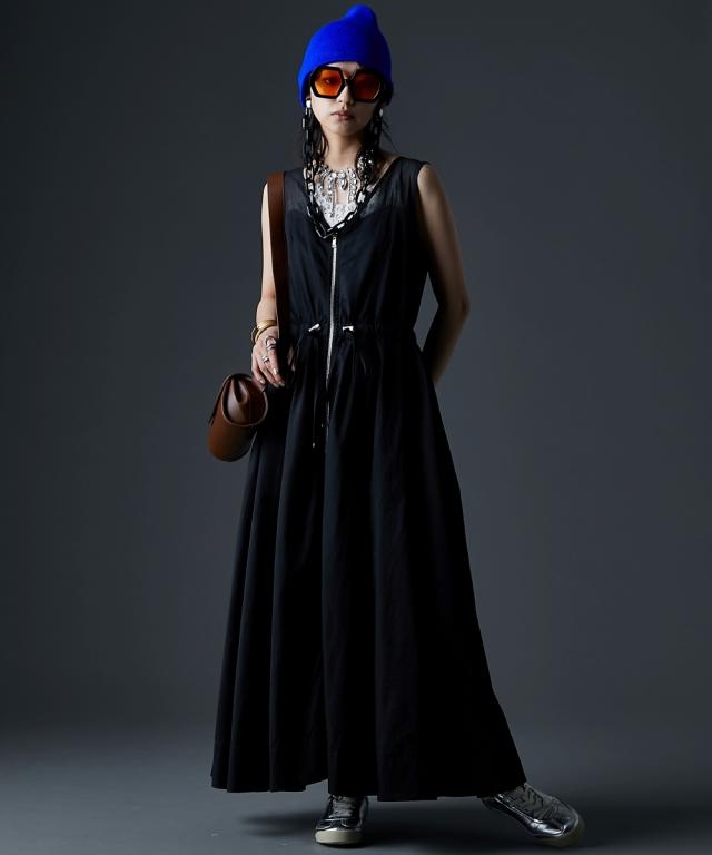 カジュアルなのにどこかモード、主役級ロングワンピース。 ■デザイン 肩の部分だけシアー素材を使用したトレンド感のあるデザイン。 身頃はスッキリとしたサイズ感、スカート部分はボリュームのある女性らしいフレアのフィット&フレアシルエット。 フロントはダブルジップ仕様なので着脱が楽なだけでなく、スカート裾ジップを開けて深いスリットにする事も可能。 ■素材 程良く光沢感と張り感のある綿ポリエステルナイロン素材を使用。 ■おすすめのスタイリング 肩部分が透けているのと胸元は大きくあいているので、インナーにキャミソール、タンクトップ、ベアトップ等のインナーを着用してください。 合わせるインナーのデザインによりカジュアルにもフェミニンにもイメージが変えられます。
