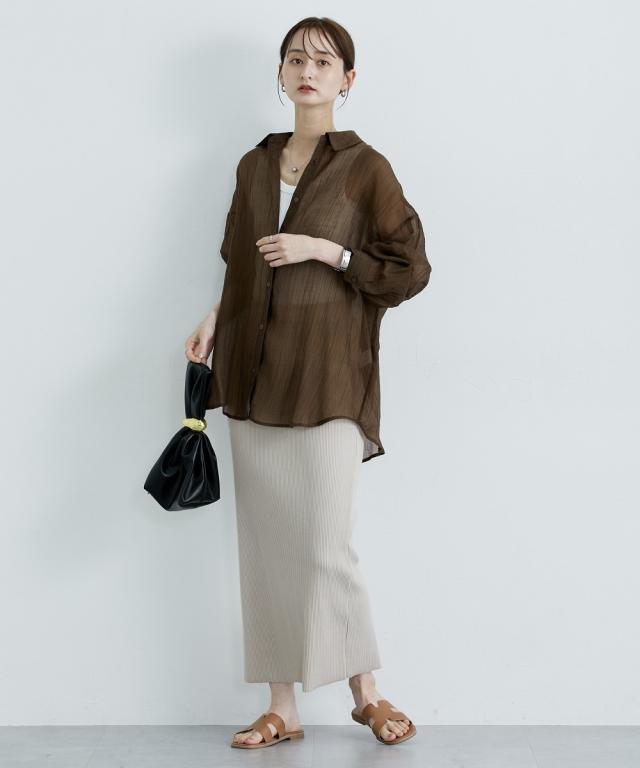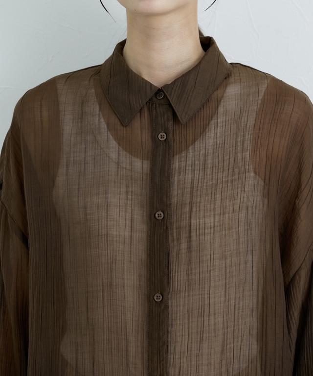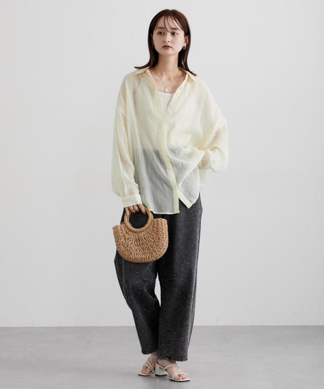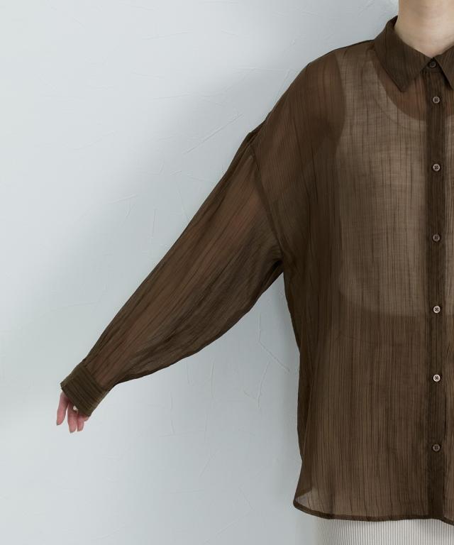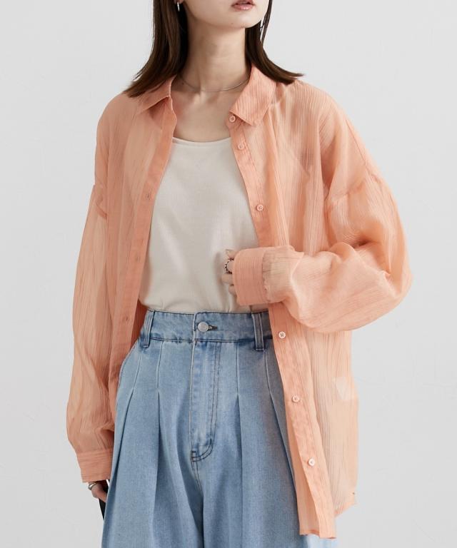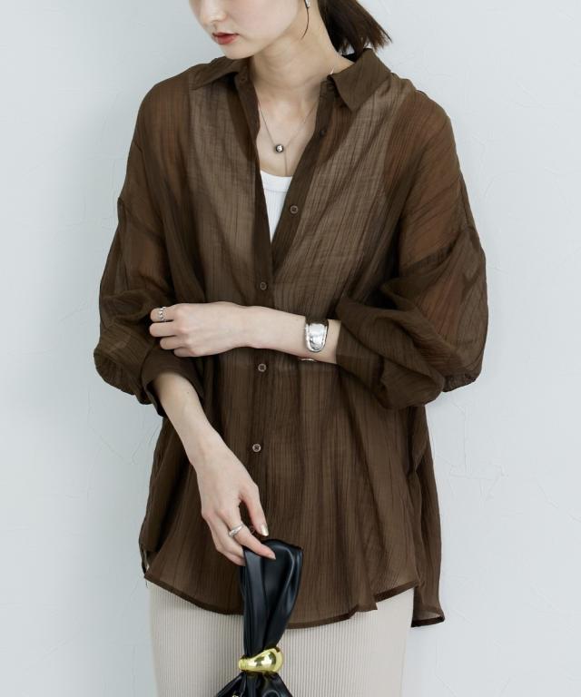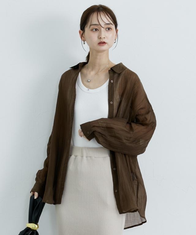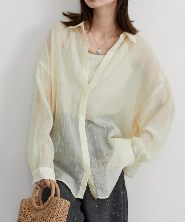■デザイン ゆるシルエットが今年らしいシアーシャツ。涼し気なドビー素材で秋にかけて着まわせる便利なアイテム。はおるだけで抜け感のあるコーデが即完成するおすすめのアイテムです。 ■素材 上品な透け感のシアードビー生地を使用。ストライプ柄の地模様になっているのでしわもめだちにくくお手入れしやすい!ほんのり上品な光沢感もあるのでカジュアル過ぎないのもポイントです。 ■おすすめのスタイリング 長袖のレギュラーシャツタイプなので、今年らしくシアー感を活かしたコーデがおすすめ。キャミソールにさっと羽織ったり、ワンピースの羽織にもおすすめ。オンからオフまで着まわせるマストバイなシャツです。