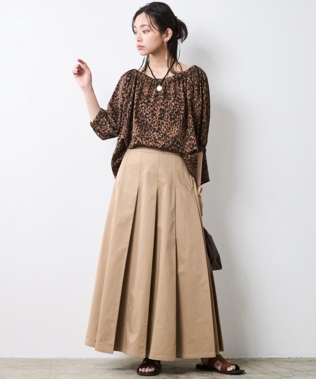 オトナカジュアルスタイルのアクセントになるレオパード柄ブラウス。 ■デザイン 衿ぐりがゴム仕様になっているので、通常のクルーネックや両肩を落としたオフショルダーや片肩を落としたワンショルダー風等着方を変えられるデザイン。 衿ぐりには共生地のヒモが入っているので、衿ぐりの大きさの調整も可能。 ゆったりとしたシルエットとギャザーを寄せたネックラインやリラックスした着心地とオトナフェミニンな印象を両立します。 袖は5分袖で程よいボリュームがあり二の腕もカバーしてくれます。 ■素材 滑らかで落ち感のある生地を使用しており肌触りが良く、着ぶくれの心配はありません。 ■おすすめのスタイリング デニムパンツやベイカーパンツを合わせた、こなれ感のあるカジュアルスタイルやタイトスカートやタックスカートを合わせたキレイ目スタイルもオススメです。 別売り同素材のレオパードプリントパンツと合わせていただければセットアップになります。