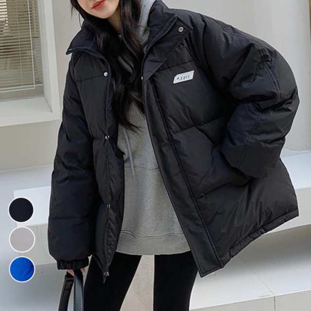 レディース スタンドネック フェイクダウンコート ロゴ付きあったかいアウター カジュアル ブルゾン 体型カバージャンパー
