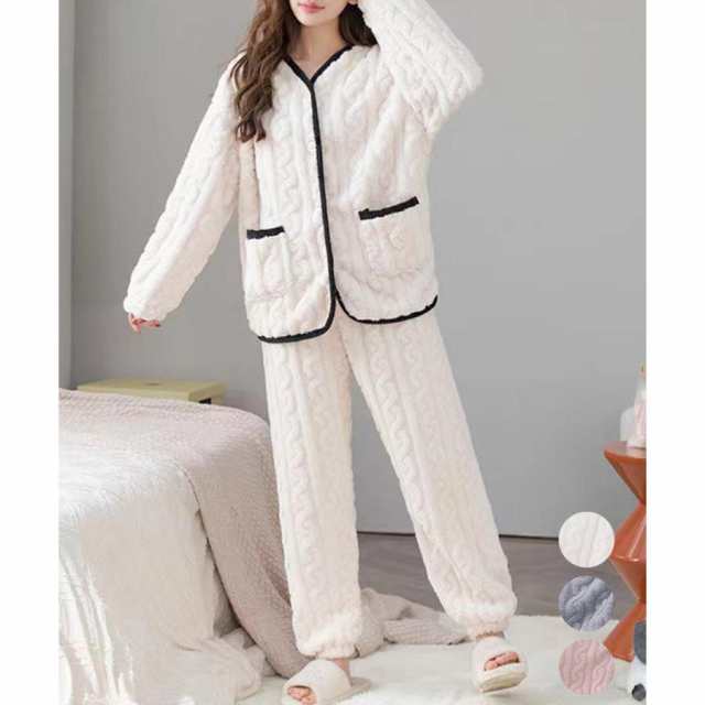 ケーブル柄ルームウェア セットアップ ポケット付き ふわふわ部屋着 軽く暖かい 長袖寝巻き もこもこボアパジャマ 冬防寒