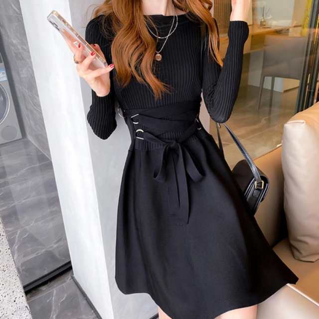 フレアワンピース レディース レースアップ 2wayリボン Aライン長袖ワンピ ウエストマーク オルチャン 20代30代