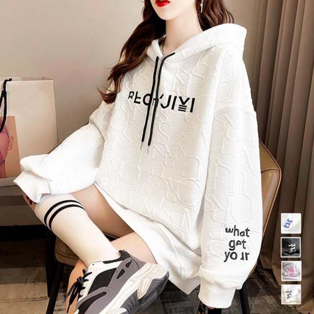 レディース フード付きスウェット 体型カバー 英字ロゴ フーディー 韓国風 ロングトレーナー 春秋冬ゆったり ストリート