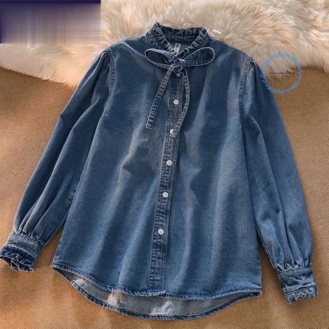 ブラウス レディース ス シャツ デニム 立ち襟 フリル リボン ボウタイ 長袖 2023 春 春服