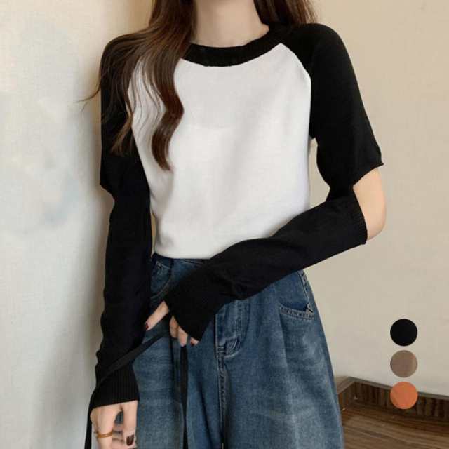 ラウンドネック 韓国風ニットウェア バイカラー レディース ニットプルオーバー 重ね着 通勤通学ニットソー カジュアル