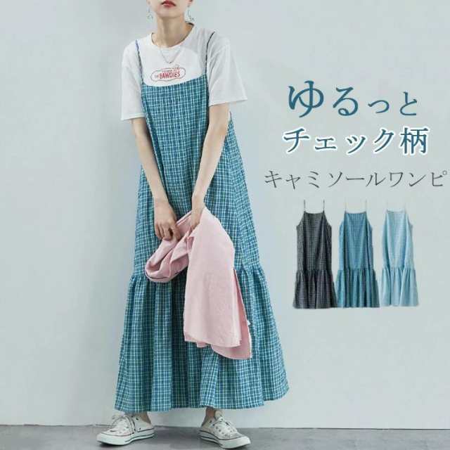ジャンパースカート レディース サロペット スカート 夏 チェック柄 キャミソールワンピース 後ろ紐 フレアワンピース 裾フリル ティアードワンピース ロング丈 オールインワン かわいい ジャンスカ 大きいサイズ ジャンパー 着痩せ カジュアル 重ね着 送料無料