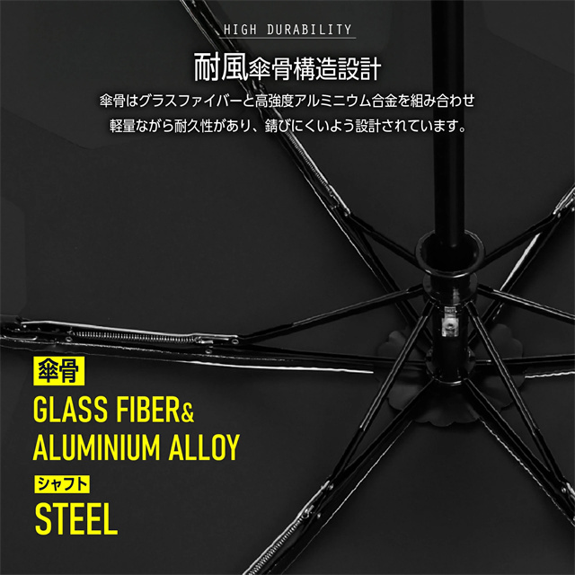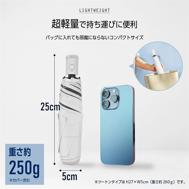 ◆サイズ 折りたたみ時(約): 単色タイプ H25cm ×D5cm ツートンタイプ H27cm ×D5cm 開いた時(約): 単色タイプ H52cm ×D92cm ツートンタイプ H52cm ×D93cm ◆重さ 単色タイプ (約)258g ツートンカラー (約)248g ◆素材 傘骨 :グラスファイバー、アルミ合金 シャフト :スチール 傘 :ポリエステル ◆傘骨数 6本 ◆付属内容 本体、カバー |