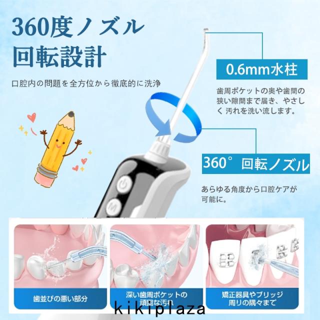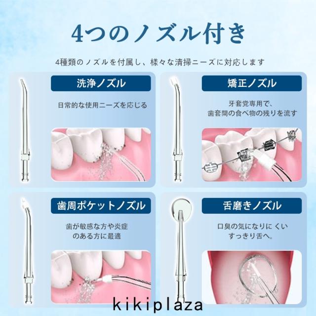 1台多役 、4本ノズル(洗浄ノズル+ソフトノズル+ポイント磨きノズル+舌用ノズル)付き、360°回転ノズル、口腔洗浄器はタンク内に貯めた水を噴射して、口内をキレイになります。ジェット水流で歯の間に詰まった食べかす除去可能です。