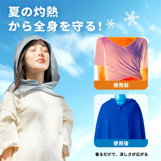 革新的なクールケープで、水に触れると急速に冷却されます。軽量な素材です。クールな防塵効果で、持続的な涼しさを実感できます。 接触した瞬間に心地よい涼感があり、汗をかいても通気性が高く、柔らかく肌になじみます。 ボタンで固定できるため、装着と取り外しが簡単で、快適な着用感を提供します。 |