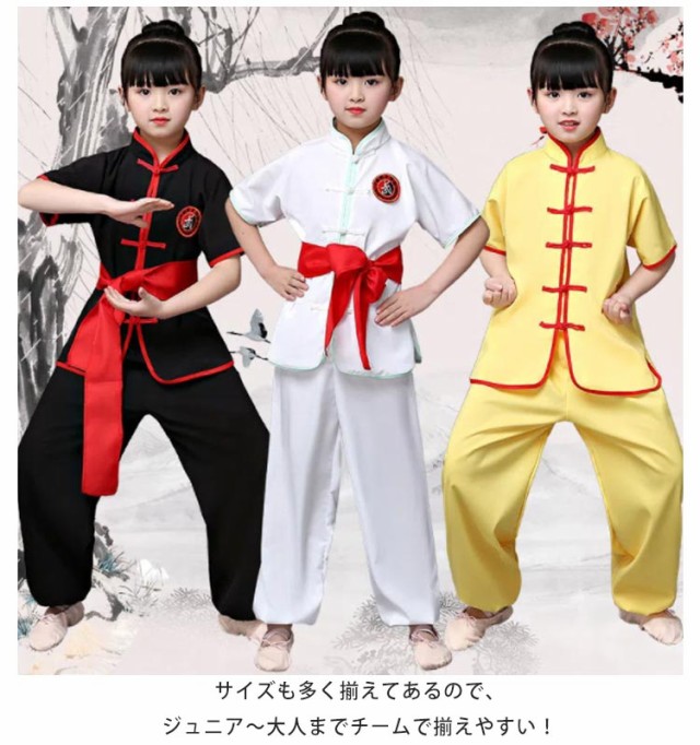 | シンプルで使いやすい子供の武術服上下セットが新登場! ステージやパーティーでお子様がかっこよく変身!目立っちゃう事まちがいなし!! ウエストはゴムがはいっておりますのできつい場合はゴムの調節が必要になります。 軽くて動きやすいから、普段着から運動着まで使い勝手がいいですよ。 サイズも多く揃えてあるので、ジュニア?大人までチームで揃えやすい! | |