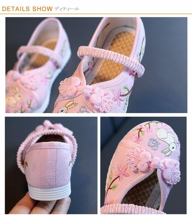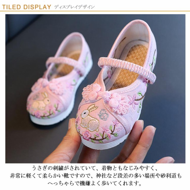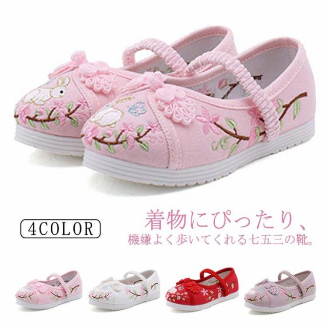 | 着物にぴったり、機嫌よく歩いてくれる七五三の靴。 うさぎの刺繍がされていて、着物ともなじみやすく、非常に軽くて柔らかい靴ですので、神社など段差の多い場所や砂利道もへっちゃらで機嫌よく歩いてくれます。 軽くて柔らかい綿素材でムレにくく、長時間履いても痛くなりにくい! ゴムの甲ベルトも付いているのですぽっと脱げてしまうこともありません。 発表会、イベント、写真記念、お祭、コスプレ、日常など大活躍です! | |