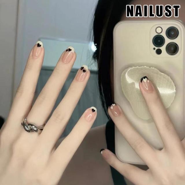 ネイル チップ かわいいハートデザイン 春夏大人気韓国フレンチネイルシール ショートロングホワイト黒つけ爪 雰囲気感高級感 透明感?光沢感 貼るだけ簡単ネイ