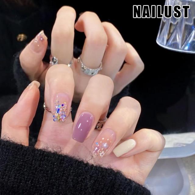 ネイル チップ かわいいキラキラ花フラワーデザイン 春夏大人気ネイルシール ショートロング宝石パープルホワイトつけ爪 雰囲気感高級感 透明感?光沢感 貼るだ