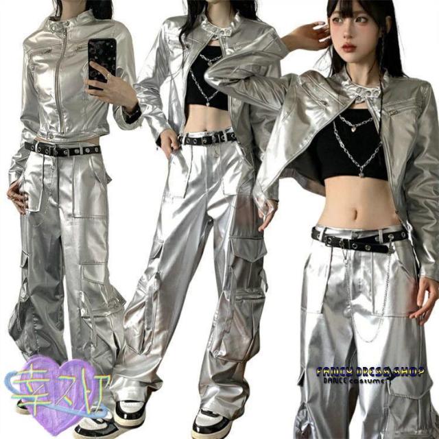 ジャズダンス 衣装 大人 レディース シルバー セットアップ レーシング ジャケット パンツ 長袖 k-pop 銀色 ステージ衣装 ヒップホップ ストリート 演出服 カー