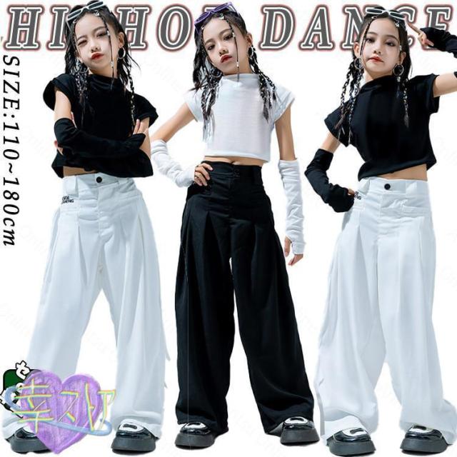 キッズ ダンス 衣装 おしゃれ かっこいい かわいい 女の子 セットアップ ゆったり 白 黒 トップス パンツ 腕カバー ジャズダンス ヒップホップ 派手 韓国 kpop