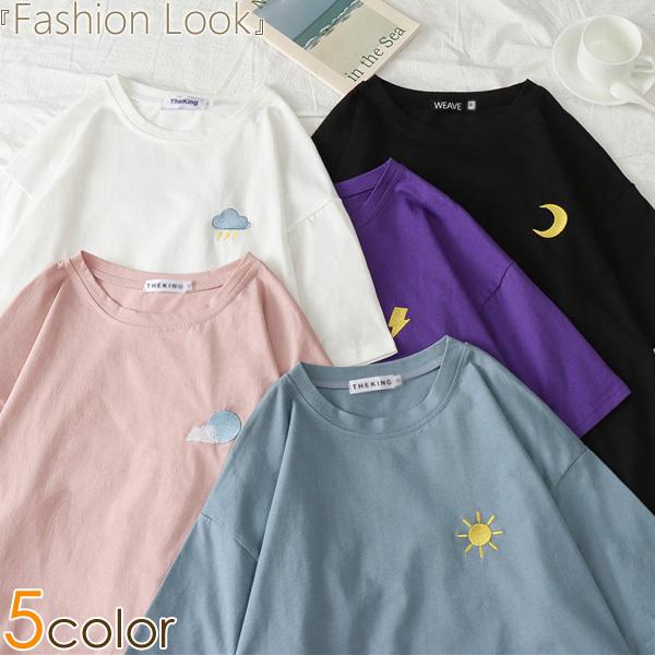 トップス Tシャツ 夏Tシャツ ラウンド襟 刺繍 太陽 月 雲 雨 雷 天気マーク 無地 夏 新作