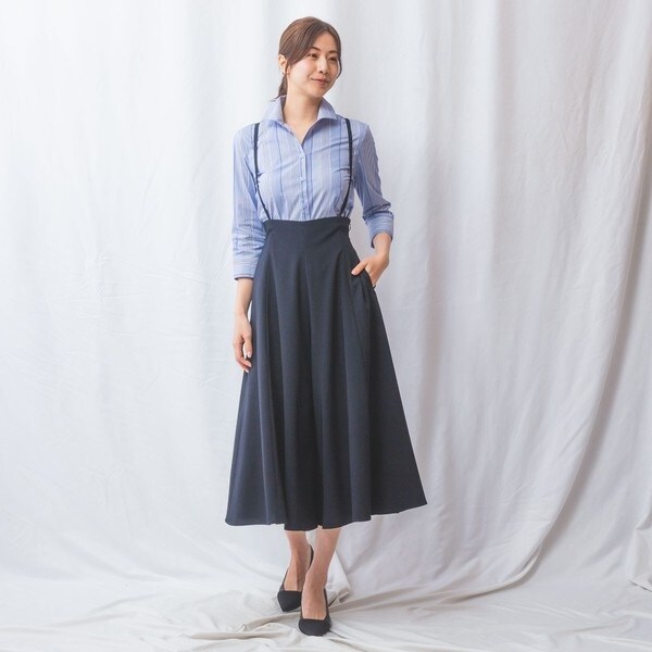 動くたびにひらりと揺れるフレアシルエットが女性らしさを演出するサス付きフレアパンツ。サスペンダーは取り外し可能なので、気分やシーンに合わせて使い分けを楽しめます。バックのウエストはゴム仕様のため、フィット感のある着心地を実現。便利なサイドポケット付きもポイントです。シャツやカットソーなど、合わせるトップスによって印象の変化を楽しめるアイテムです。