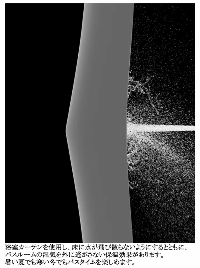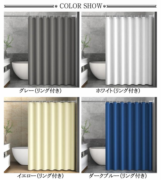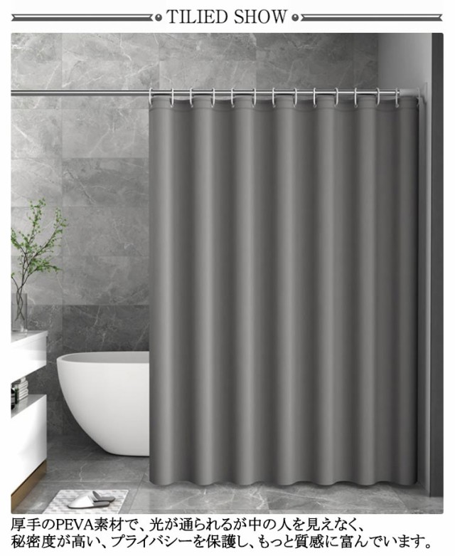 | リング付! 採光性よく・透けない・遮像シャワーカーテン。 厚手のPEVA素材で、光が通られるが中の人を見えなく、秘密度が高い、プライバシーを保護し、もっと質感に富んでいます。 防水性・防カビに優れ、熱や冷気を通しにくい。浴室のシャワーカーテンとしてはもちろん、ちょっとした目かくしや、暖房、冷房の効率アップにも。 透けないからシャワーする時がとても安心。収納スベースや、脱衣所等の空間は来客などの目に触れません、目隠しかーてんにもぴったり。 浴室カーテンを使用し、床に水が飛び散らないようにするとともに、バスルームの湿気を外に逃がさない保温効果があります。暑い夏でも寒い冬でもバスタイムを楽しめます。 カーテンリング付属しているので、カーテンポールに引っ掛けるだけで取付できます。(カーテンポールは付属しません。) | |