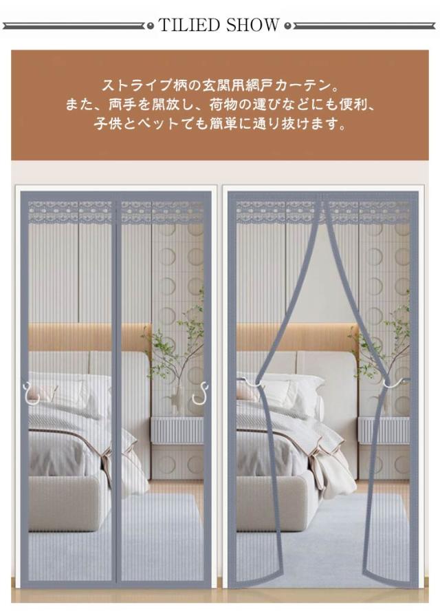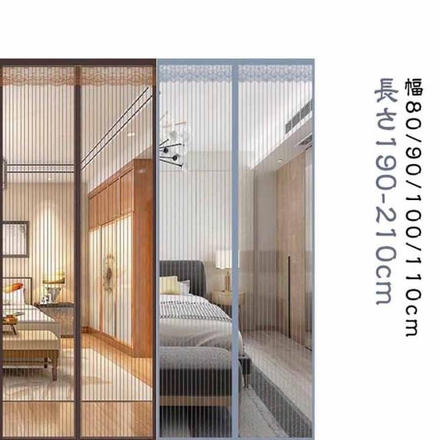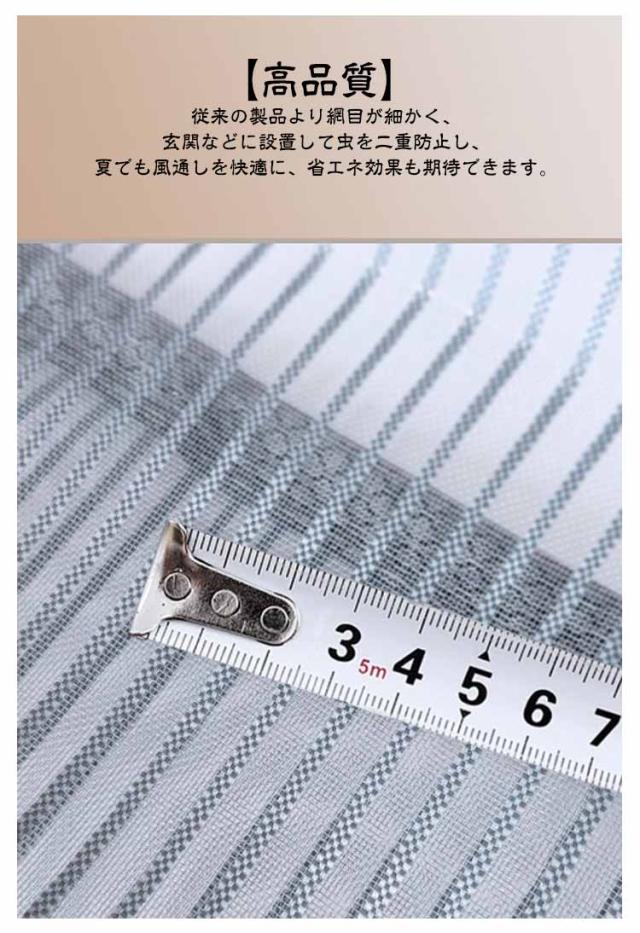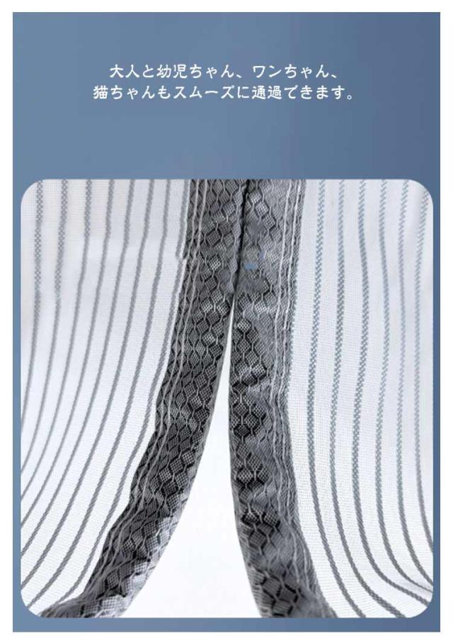 | ストライプ柄の玄関用網戸カーテン。【幅80/90/100/110cm】【長さ190−210cm】 嵌め込み式で縫製仕上げの強力な磁石により、従来品より騒音をさらに低減し、お子様の睡眠や大人の読書などを妨げない網戸カーテンです。 また、両手を開放し、荷物の運びなどにも便利、子供とペットでも簡単に通り抜けます。 中央の開閉部分は強力なマグネットが縫い付けられ、エッジが強化されまして、開ける瞬間には自動的にギャップなしで閉まります。 大人と幼児ちゃん、ワンちゃん、猫ちゃんもスムーズに通過できます。 網戸カーテンを開けた後、底に入れる重りで、自動的に元の位置に落ちて、ギャップなしで閉まります。 【高品質】従来の製品より網目が細かく、玄関などに設置して虫を二重防止し、夏でも風通しを快適に、省エネ効果も期待できます。 【空気循環】風が通る機能的な 空気循環を可能!虫を防ぎながら新鮮な空気が入ることを可能です。外の風景が見やすいように空間率を大きくしています。空気の流通にも邪魔しません。 【面ファスナー式】非常に強い接着剤&面ファスナーで、引き裂いても大丈夫です。 【取り付け簡単】木製や鉄製などドアの素材を選ばず、玄関、寝室、勝手口、ベランダなどに簡単に取り付けることができます。 【収納便利】使わないときは折り畳んで、コンパクトサイズ収納便利です。 | |