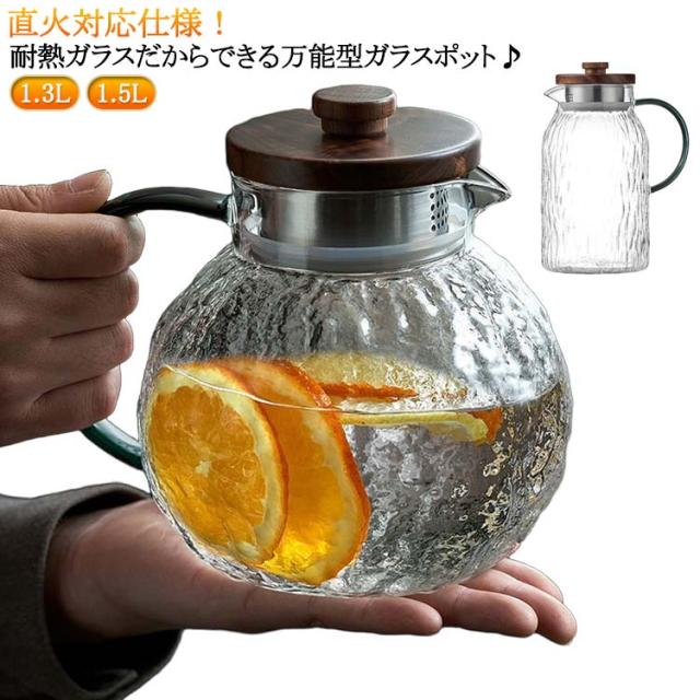 | 直火対応仕様!耐熱ガラスだからできる万能型ガラスポット♪1.3L 1.5L いつまでも 愛され続ける耐熱ガラスピッチャー ハンドルのライン、角度、厚みは握ったときの指の位置や、 持ち上げたときにかかる重力、注ぐときの力点、 これらの3つの要素の微妙なバランスを考えて設計されています。 上質感があり、様々なテーブルシーンにもあうデザインです。 耐熱ガラス製で清潔に保て、熱いお湯から作るものも安心です。 ミネラルウォータージャグとしてはもちろん、 夏は冷たいフレッシュジュースや麦茶、 アイスティーなど冷たい飲み物を手軽に作れてキープできるクールサーバーです。 冬には暖かいお茶など1年を通してお使いいただけます。 | |