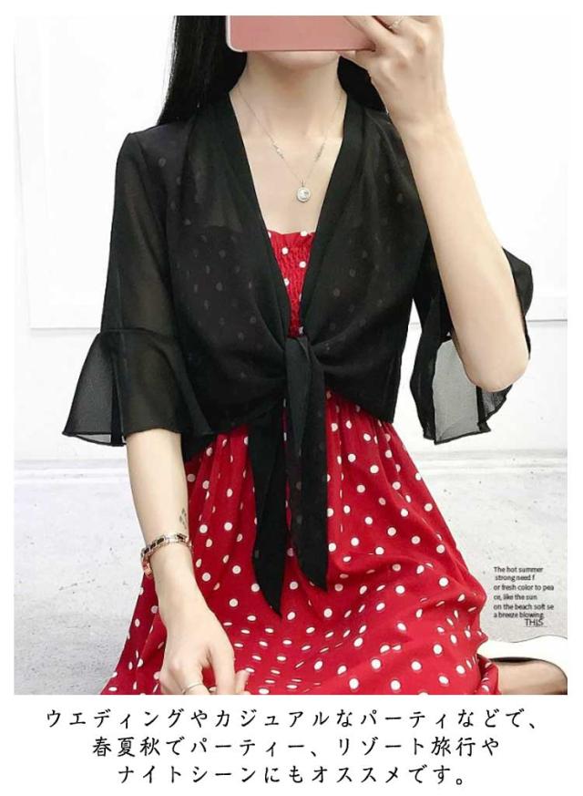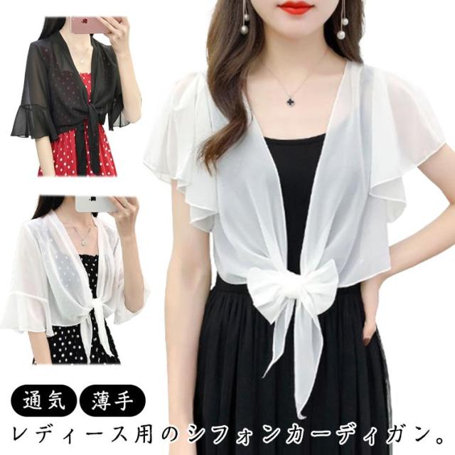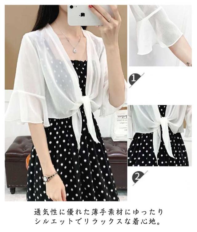 可愛い 夏 ショール 羽織り サマーカーディガン 薄手 サマーカーディガン レディース 通気 七分袖 ショート丈 冷房対策 UVカット対策 紫外線対策 シフォン フレア袖 透け感 エレガント おしゃれ 重ね着 レイヤード
