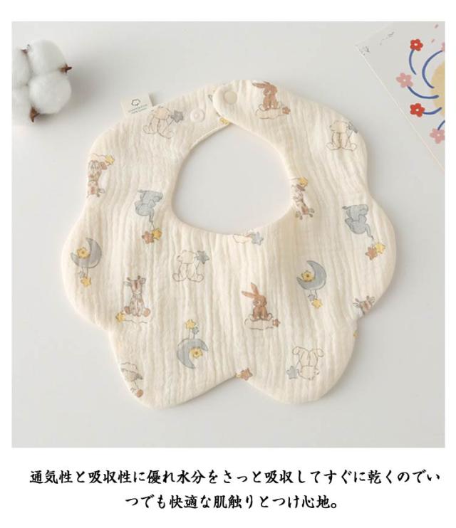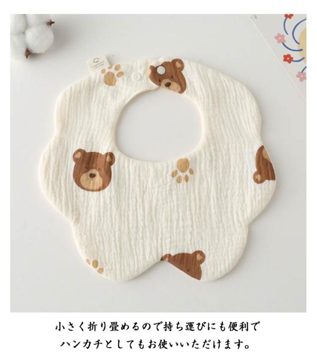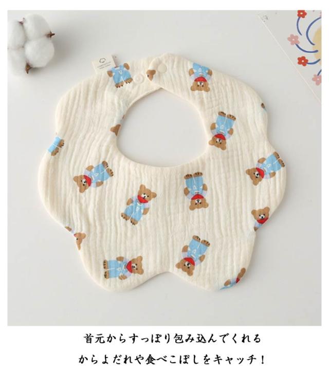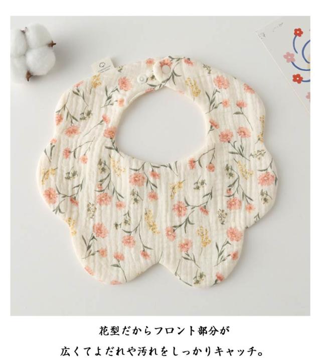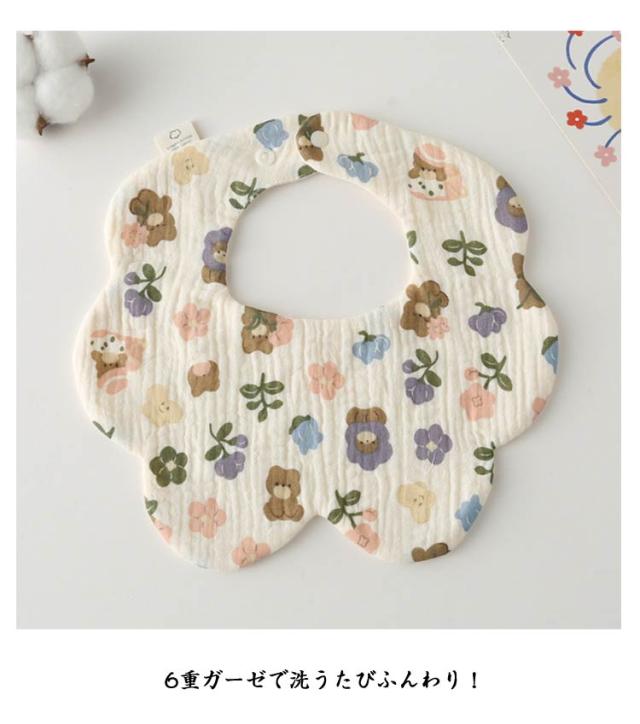 | 赤ちゃんに触れる商品だから安心の綿(ガーゼ)素材を使用。 首元からすっぽり包み込んでくれるからよだれや食べこぼしをキャッチ! 花型だからフロント部分が広くてよだれや汚れをしっかりキャッチ。 小さく折り畳めるので持ち運びにも便利でハンカチとしてもお使いいただけます。 6重ガーゼで洗うたびふんわり! 通気性と吸収性に優れ水分をさっと吸収してすぐに乾くのでいつでも快適な肌触りとつけ心地。 | |