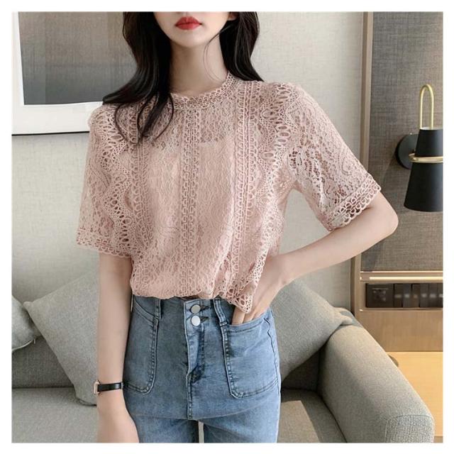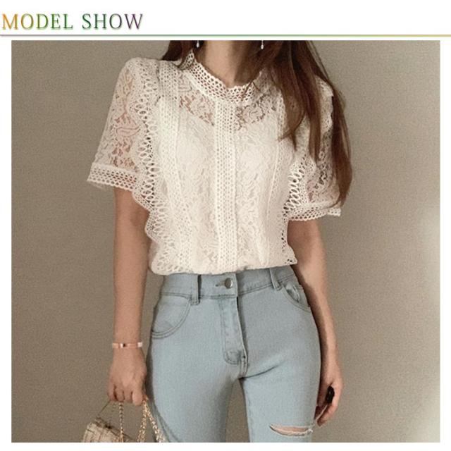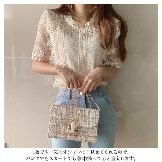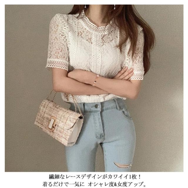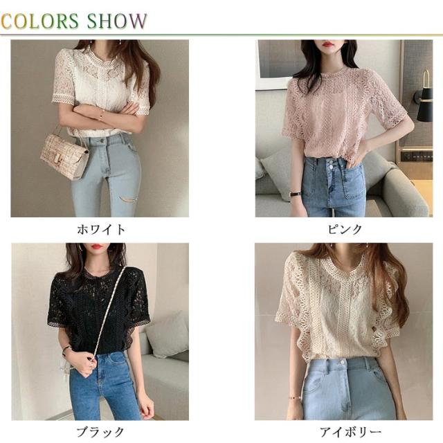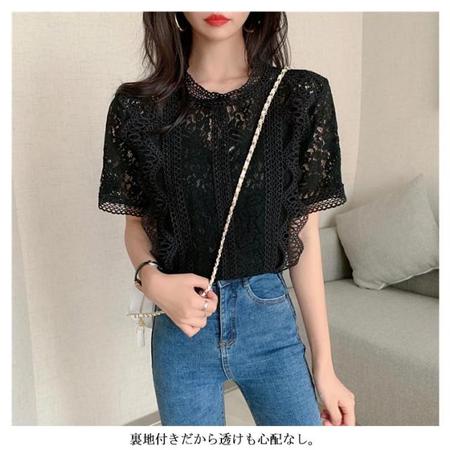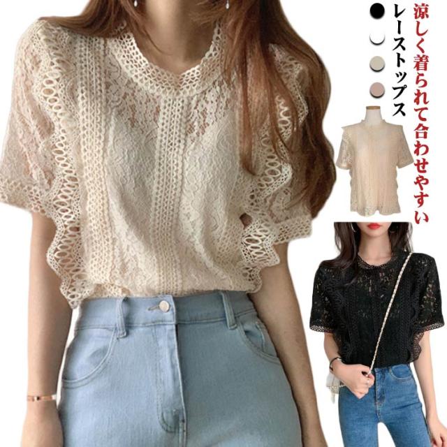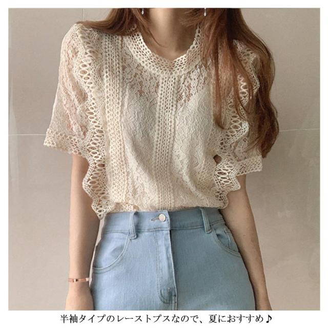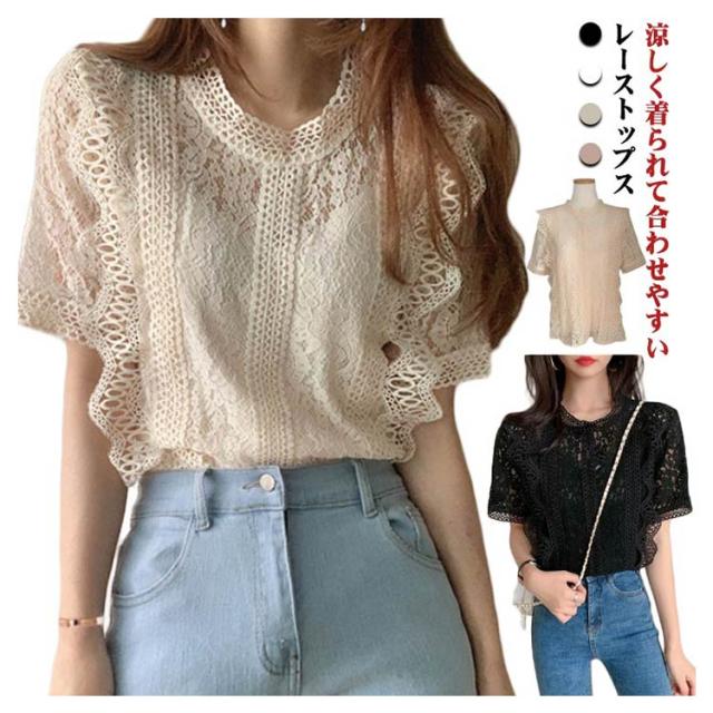 レース フリル 半袖 可愛い レースブラウス きれいめ トップス レディース カジュアル 上品 トップス 夏服 女性 大人 かわいい 透け感 レースデザイン 夏 サマー レース 体型カバー 薄手 着?せ 体型カバー